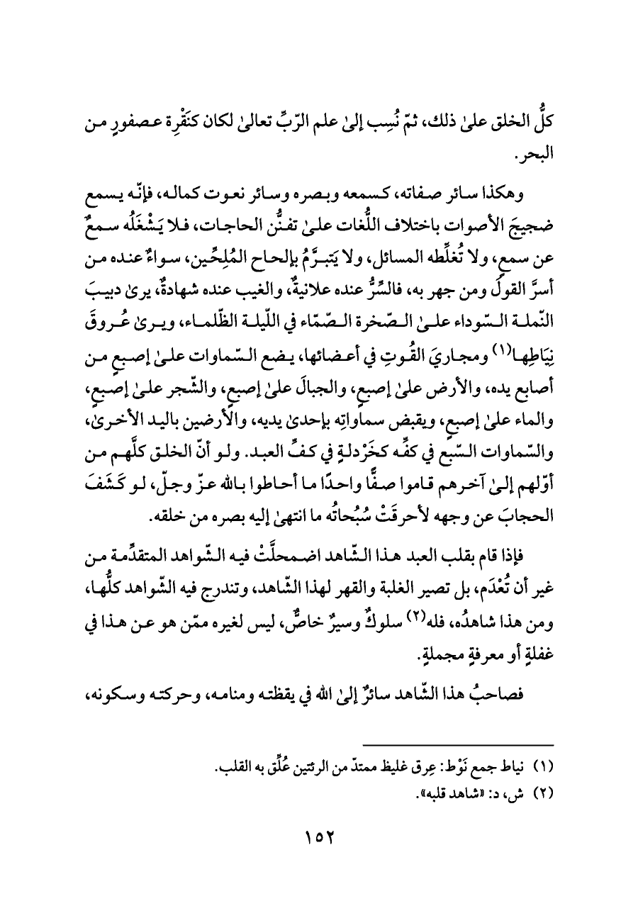 وهكذا سائر صفاته، كسمعه وبصره وسائر نعوت كماله، فإنّه يسمع ضجيجَ الأصوات باختلاف اللُّغات على تفنُّن الحاجات، فلا يَشْغَلُه سمعٌ عن سمعٍ، ولا تُغلِّطه المسائل، ولا يَتبرَّمُ بإلحاح المُلِحِّين، سواءٌ عنده من أسرَّ القولَ ومن جهر به، فالسِّرُّ عنده علانيةٌ، والغيب عنده شهادةٌ، يرى دبيبَ النّملة السّوداء على الصّخرة الصّمّاء في اللّيلة الظّلماء، ويرى عُروقَ نِيَاطِها (¬١) ومجاريَ القُوتِ في أعضائها، يضع السّماوات على إصبعٍ من أصابع يده، والأرض على إصبعٍ، والجبالَ على إصبعٍ، والشّجر على إصبعٍ، والماء على إصبعٍ، ويقبض سماواتِه بإحدى يديه، والأرضين باليد الأخرى، والسّماوات السّبع في كفِّه كخَرْدلةٍ في كفِّ العبد. ولو أنّ الخلق كلَّهم من أوّلهم إلى آخرهم قاموا صفًّا واحدًا ما أحاطوا بالله عزّ وجلّ، لو كَشَفَ الحجابَ عن وجهه لأحرقَتْ سُبُحاتُه ما انتهى إليه بصره من خلقه.