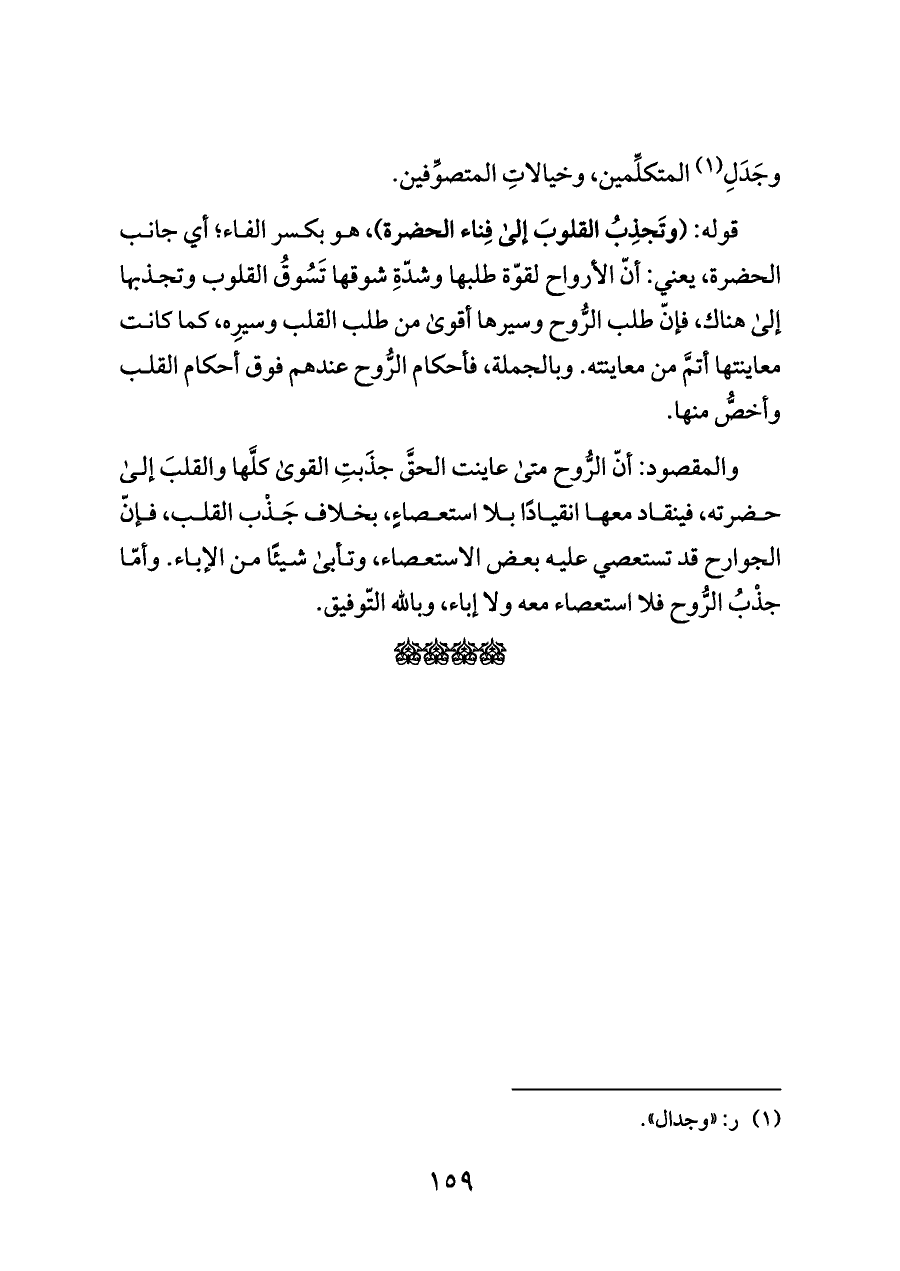 والمقصود: أنّ الرُّوح متى عاينت الحقَّ جذَبتِ القوى كلَّها والقلبَ إلى حضرته، فينقاد معها انقيادًا بلا استعصاءٍ، بخلاف جَذْب القلب، فإنّ الجوارح قد تستعصي عليه بعض الاستعصاء، وتأبى شيئًا من الإباء. وأمّا جذْبُ الرُّوح فلا استعصاء معه ولا إباء، وبالله التّوفيق.