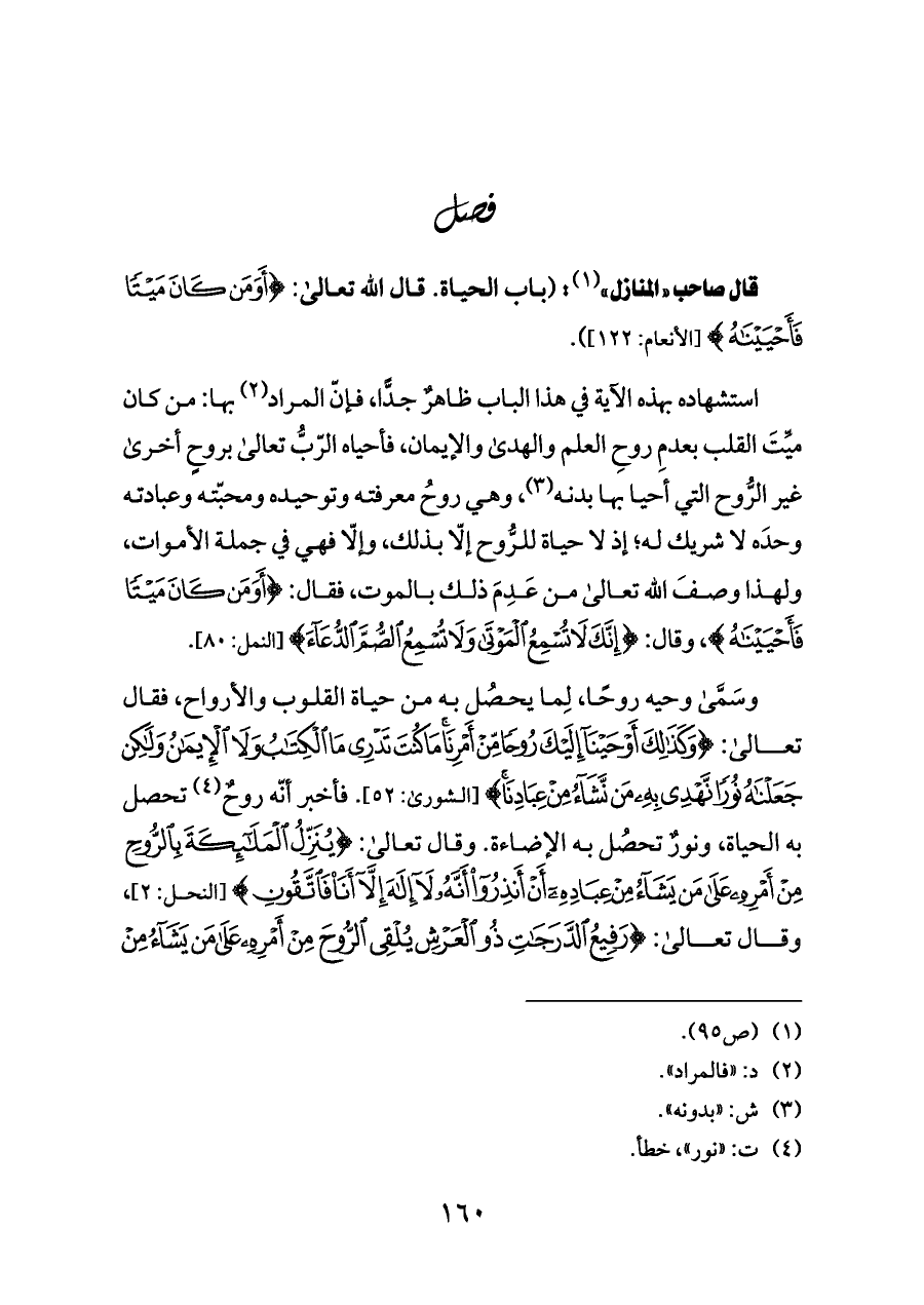 قال صاحب «المنازل» (¬١): (باب الحياة. قال الله تعالى: {أَوَمَنْ كَانَ مَيْتًا فَأَحْيَيْنَاهُ} [الأنعام: ١٢٢]).