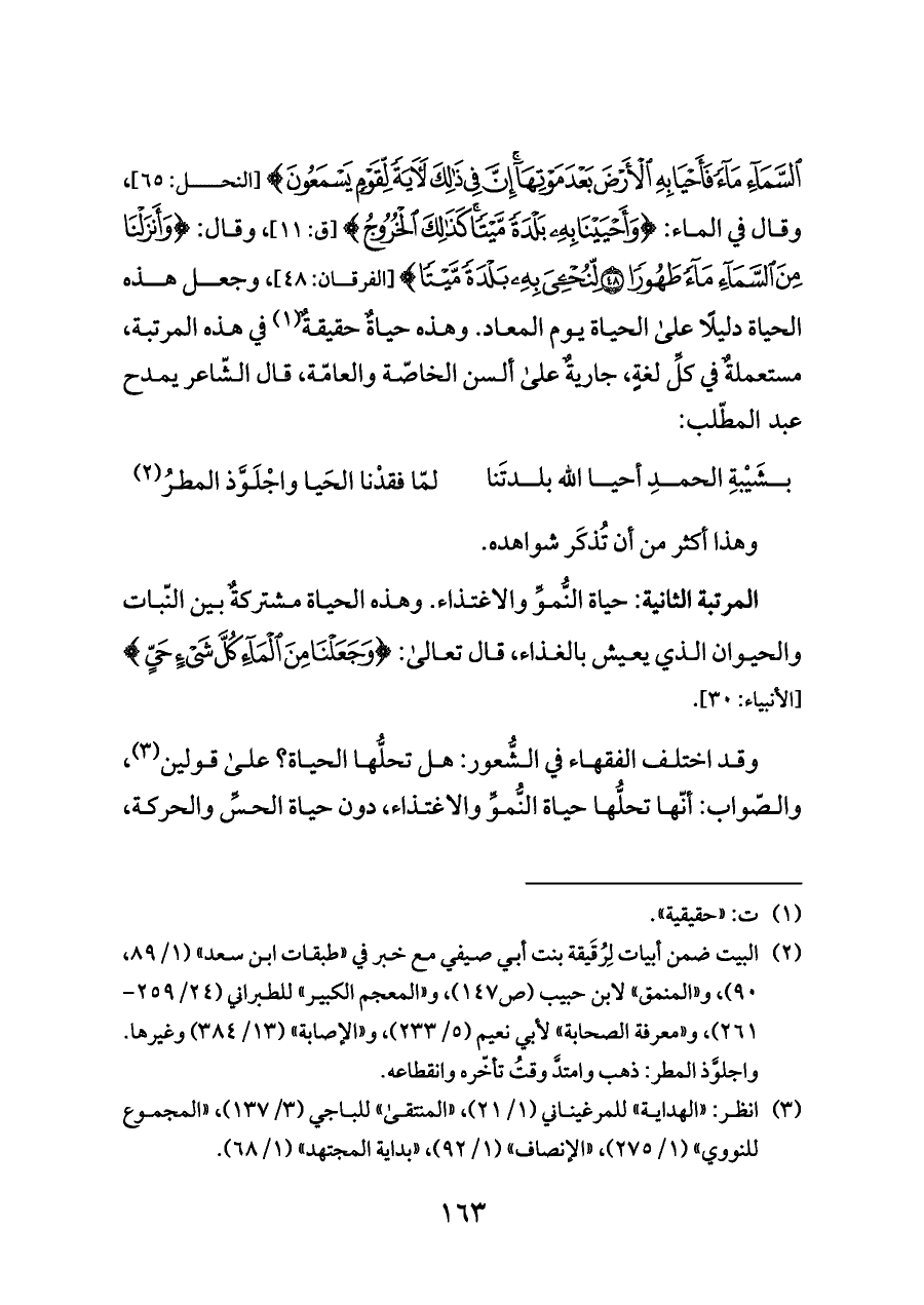 السَّمَاءِ مَاءً فَأَحْيَا بِهِ الْأَرْضَ بَعْدَ مَوْتِهَا إِنَّ فِي ذَلِكَ لَآيَةً لِقَوْمٍ يَسْمَعُونَ} [النحل: ٦٥]، وقال في الماء: {وَأَحْيَيْنَا بِهِ بَلْدَةً مَيْتًا كَذَلِكَ الْخُرُوجُ} [ق: ١١]، وقال: {وَأَنْزَلْنَا مِنَ السَّمَاءِ مَاءً طَهُورًا (٤٨) لِنُحْيِيَ بِهِ بَلْدَةً} [الفرقان: ٤٨]، وجعل هذه الحياة دليلًا على الحياة يوم المعاد. وهذه حياةٌ حقيقةٌ (¬١) في هذه المرتبة، مستعملةٌ في كلِّ لغةٍ، جاريةٌ على ألسن الخاصّة والعامّة، قال الشّاعر يمدح عبد المطّلب: