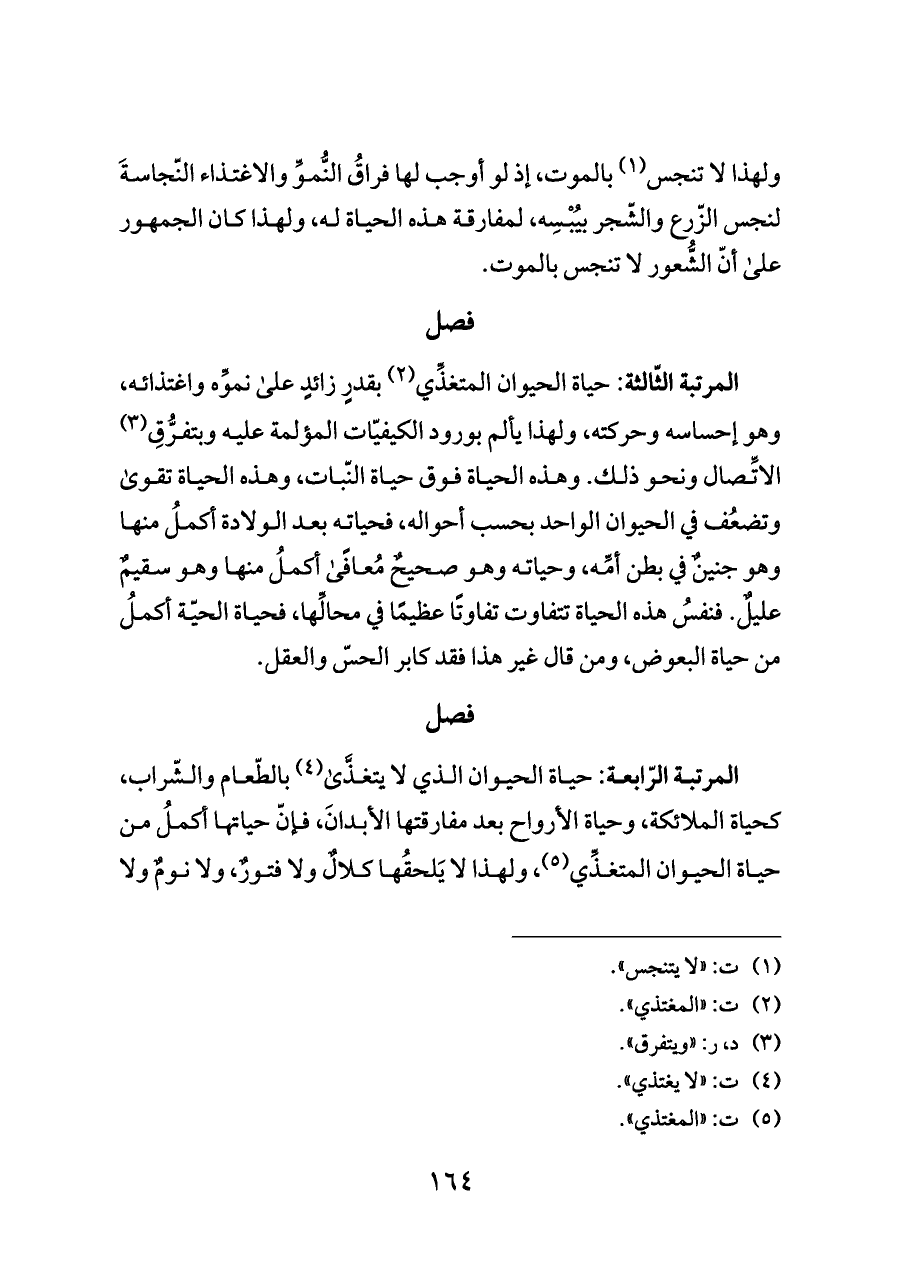 المرتبة الثّالثة: حياة الحيوان المتغذِّي (¬٢) بقدرٍ زائدٍ على نموِّه واغتذائه، وهو إحساسه وحركته، ولهذا يألم بورود الكيفيّات المؤلمة عليه وبتفرُّقِ (¬٣) الاتِّصال ونحو ذلك. وهذه الحياة فوق حياة النّبات، وهذه الحياة تقوى وتضعُف في الحيوان الواحد بحسب أحواله، فحياته بعد الولادة أكملُ منها وهو جنينٌ في بطن أمِّه، وحياته وهو صحيحٌ مُعافًى أكملُ منها وهو سقيمٌ عليلٌ. فنفسُ هذه الحياة تتفاوت تفاوتًا عظيمًا في محالِّها، فحياة الحيّة أكملُ من حياة البعوض، ومن قال غير هذا فقد كابر الحسّ والعقل.