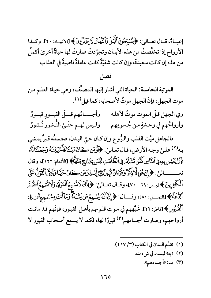 فالجاهل ميِّت القلب والرُّوح وإن كان حيَّ البدن، فجسدُه قبرٌ يمشي به (¬٢) على وجه الأرض، قال تعالى: {أَوَمَنْ كَانَ مَيْتًا فَأَحْيَيْنَاهُ وَجَعَلْنَا لَهُ نُورًا يَمْشِي بِهِ فِي النَّاسِ كَمَنْ مَثَلُهُ فِي الظُّلُمَاتِ لَيْسَ بِخَارِجٍ مِنْهَا} [الأنعام: ١٢٢]، وقال تعالى: {إِنْ هُوَ إِلَّا ذِكْرٌ وَقُرْآنٌ مُبِينٌ (٦٩) لِيُنْذِرَ مَنْ كَانَ حَيًّا وَيَحِقَّ الْقَوْلُ عَلَى الْكَافِرِينَ} [يس: ٦٩ - ٧٠]، وقال تعالى: {إِنَّكَ لَا تُسْمِعُ الْمَوْتَى وَلَا تُسْمِعُ الصُّمَّ الدُّعَاءَ} [النمل: ٨٠]، وقال: {إِنَّ اللَّهَ يُسْمِعُ مَنْ يَشَاءُ وَمَا أَنْتَ بِمُسْمِعٍ مَنْ فِي الْقُبُورِ} [فاطر: ٢٢]. شَبَّههم في موت قلوبهم بأهل القبور، فإنّهم قد ماتت أرواحهم، وصارت أجسامهم (¬٣) قبورًا لها، فكما لا يسمع أصحاب القبور لا