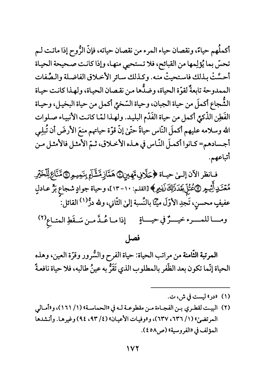 فانظر الآن إلى حياة {حَلَّافٍ مَهِينٍ (١٠) هَمَّازٍ مَشَّاءٍ بِنَمِيمٍ (١١) مَنَّاعٍ لِلْخَيْرِ مُعْتَدٍ أَثِيمٍ (١٢) عُتُلٍّ بَعْدَ ذَلِكَ زَنِيمٍ} [القلم: ١٠ - ١٣]، وحياة جوادٍ شجاعٍ بَرٍّ عادلٍ عفيفٍ محسنٍ، تَجدِ الأوّلَ ميِّتًا بالنِّسبة إلى الثّاني، ولله درُّ (¬١) القائل: