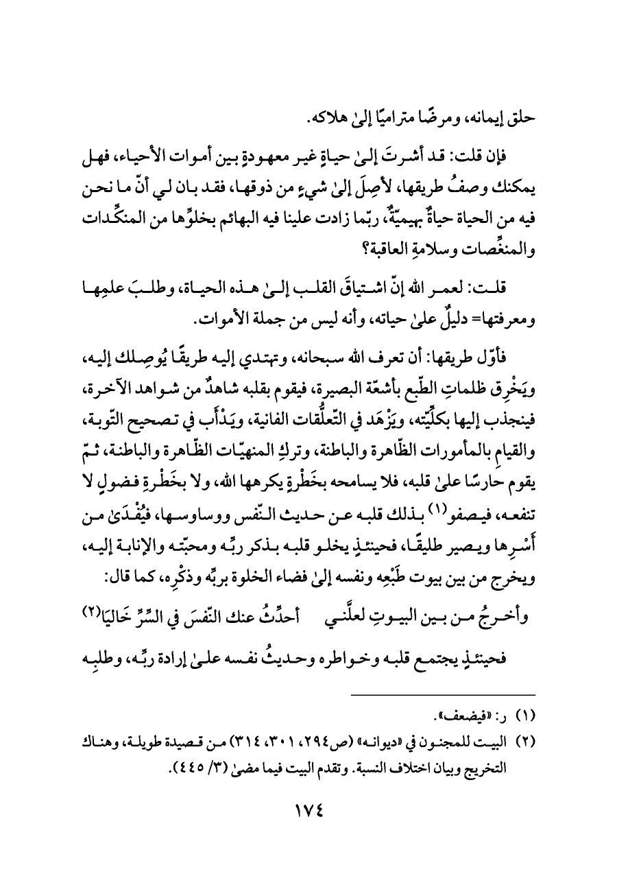 فإن قلت: قد أشرتَ إلى حياةٍ غير معهودةٍ بين أموات الأحياء، فهل يمكنك وصفُ طريقها، لأصِلَ إلى شيءٍ من ذوقها، فقد بان لي أنّ ما نحن فيه من الحياة حياةٌ بهيميّةٌ، ربّما زادت علينا فيه البهائم بخلوِّها من المنكِّدات والمنغِّصات وسلامةِ العاقبة؟
