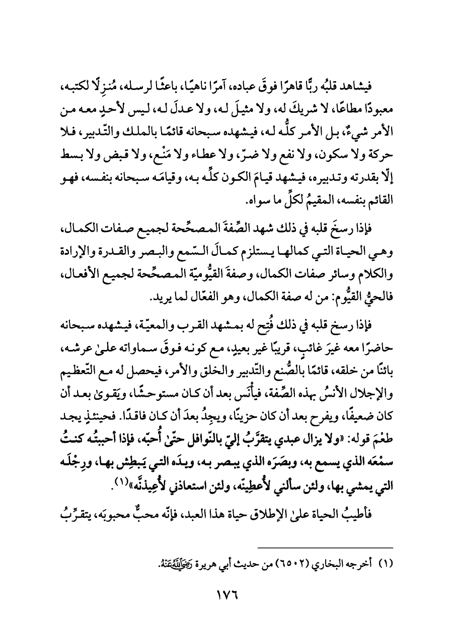 فإذا رسخَ قلبه في ذلك شهد الصِّفةَ المصحِّحة لجميع صفات الكمال، وهي الحياة التي كمالها يستلزم كمالَ السّمع والبصر والقدرة والإرادة والكلام وسائر صفات الكمال، وصفةَ القيُّوميّة المصحِّحة لجميع الأفعال، فالحيُّ القيُّوم: من له صفة الكمال، وهو الفعّال لما يريد.