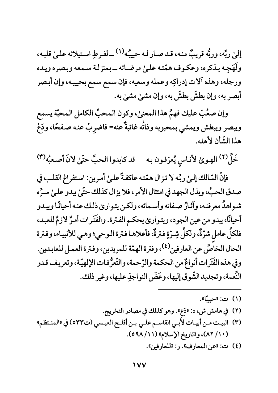 فإنّ السّالك إلى ربِّه لا تزال همّته عاكفةً على أمرين: استفراغ القلب في صدق الحبِّ، وبذل الجهد في امتثال الأمر، فلا يزال كذلك حتّى يبدو على سرِّه شواهدُ معرفته، وآثارُ صفاته وأسمائه، ولكن يتوارى ذلك عنه أحيانًا ويبدو أحيانًا، يبدو من عين الجود، ويتوارى بحكم الفترة. والفَتَرات أمرٌ لازمٌ للعبد، فلكلِّ عاملٍ شرّةٌ، ولكلِّ شِرّةٍ فترةٌ، فأعلاها فترة الوحي؛ وهي للأنبياء، وفترة الحال الخاصِّ عن العارفين (¬٤)، وفترة الهمّة للمريدين، وفترة العمل للعابدين. وفي هذه الفَتَرات أنواعٌ من الحكمة والرّحمة، والتّعرُّفات الإلهيّة، وتعريف قدر النِّعمة، وتجديد الشّوق إليها، وعَضّ النواجذِ عليها، وغير ذلك.