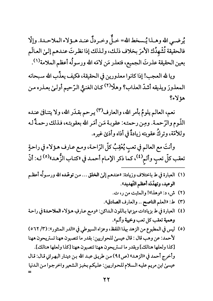 (¬٤) العبارة في ط بزيادات ميزتها باللون الداكن: «ومع عارفِ هؤلاء الملاحدة في راحة وهمية تعقب كل تعب وخيبة وألم».