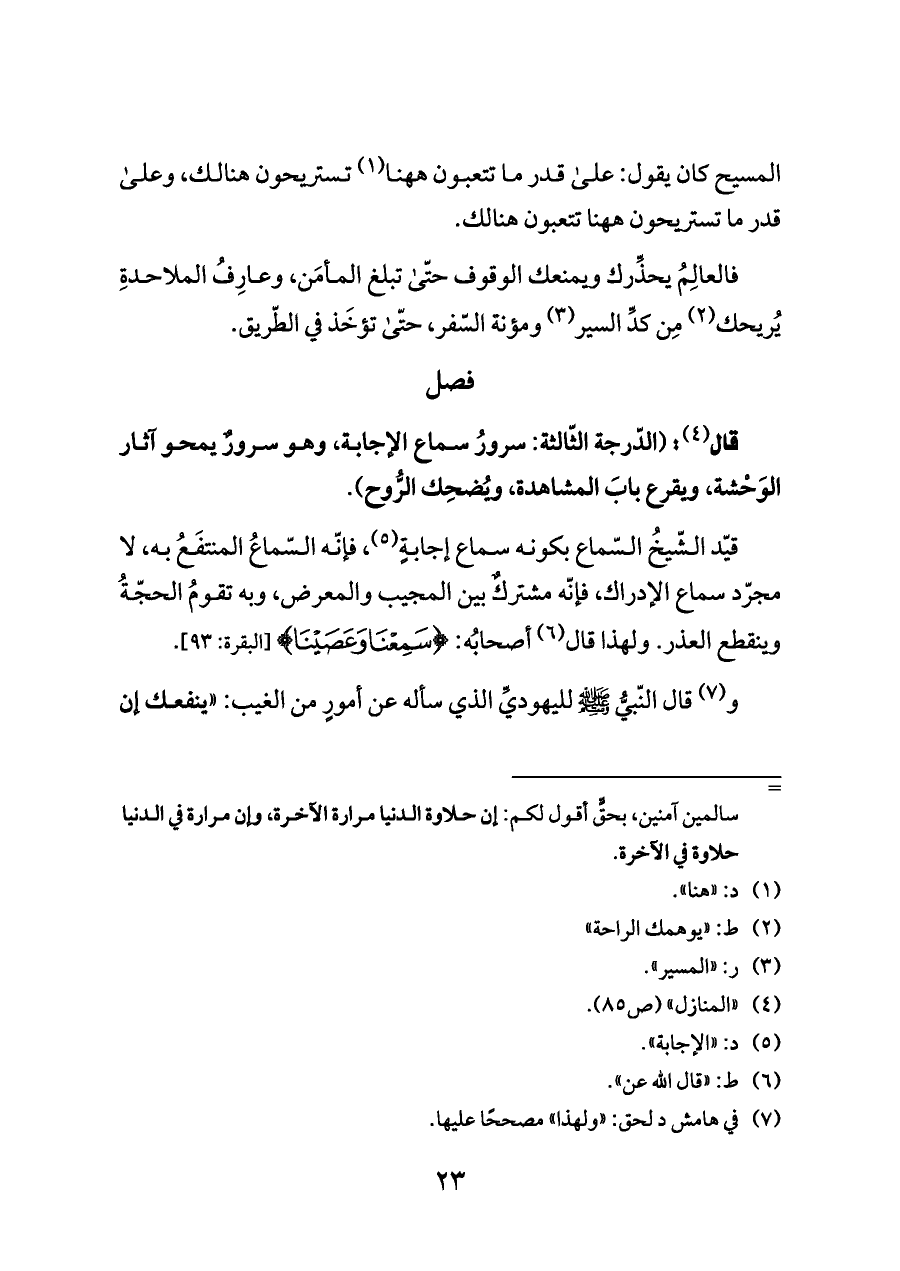 قال (¬٤): (الدّرجة الثّالثة: سرورُ سماع الإجابة، وهو سرورٌ يمحو آثار الوَحْشة، ويقرع بابَ المشاهدة، ويُضحِك الرُّوح).