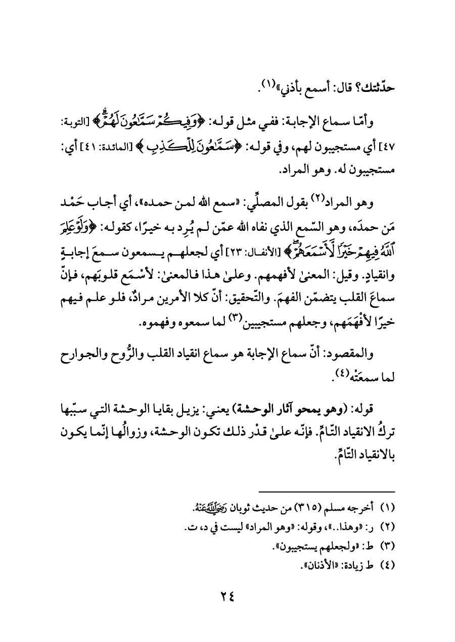والمقصود: أنّ سماع الإجابة هو سماع انقياد القلب والرُّوح والجوارح لما سمعَتْه (¬٤).