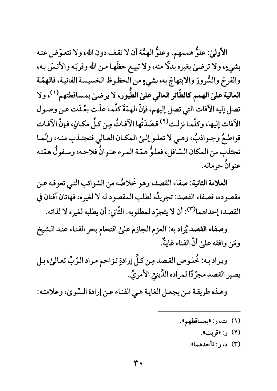 العلامة الثانية: صفاء القصد، وهو خَلاصُه من الشوائب التي تعوقه عن مقصوده، فصفاء القصد: تجريدُه لطلب المقصود له لا لغيره، فهاتان آفتان في القصد؛ إحداهما (¬٣): أن لا يتجرّد لمطلوبه. الثّاني: أن يطلبه لغيره لا لذاته.