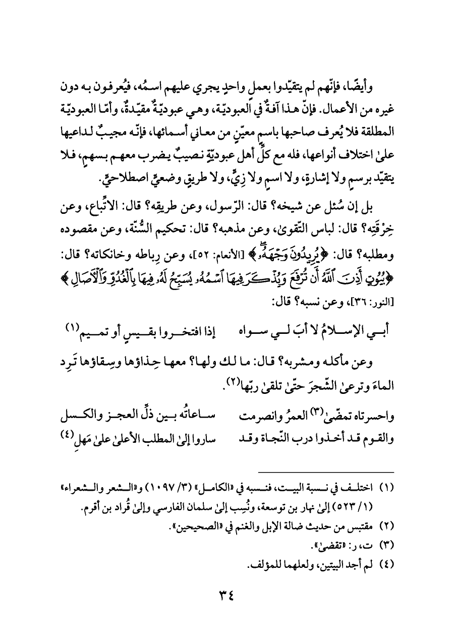 بل إن سُئل عن شيخه؟ قال: الرّسول، وعن طريقِه؟ قال: الاتِّباع، وعن خِرْقَتِه؟ قال: لباس التّقوى، وعن مذهبه؟ قال: تحكيم السُّنّة، وعن مقصوده ومطلبه؟ قال: {وَالْعَشِيِّ يُرِيدُونَ وَجْهَهُ} [الأنعام: ٥٢]، وعن رِباطه وخانكاته؟ قال: {بُيُوتٍ أَذِنَ اللَّهُ أَنْ تُرْفَعَ وَيُذْكَرَ فِيهَا اسْمُهُ يُسَبِّحُ لَهُ فِيهَا بِالْغُدُوِّ وَالْآصَالِ} [النور: ٣٦]، وعن نسبه؟ قال: