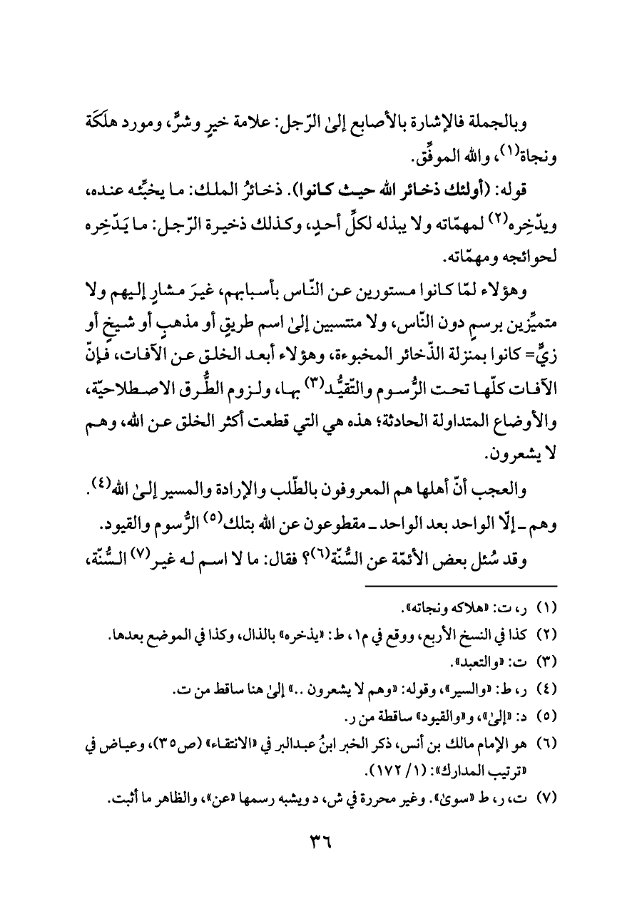 وهؤلاء لمّا كانوا مستورين عن النّاس بأسبابهم، غيرَ مشارٍ إليهم ولا متميِّزين برسمٍ دون النّاس، ولا منتسبين إلى اسم طريقٍ أو مذهبٍ أو شيخٍ أو زيٍّ= كانوا بمنزلة الذّخائر المخبوءة، وهؤلاء أبعد الخلق عن الآفات، فإنّ الآفات كلّها تحت الرُّسوم والتّقيُّد (¬٣) بها، ولزوم الطُّرق الاصطلاحيّة، والأوضاع المتداولة الحادثة؛ هذه هي التي قطعت أكثر الخلق عن الله، وهم لا يشعرون.