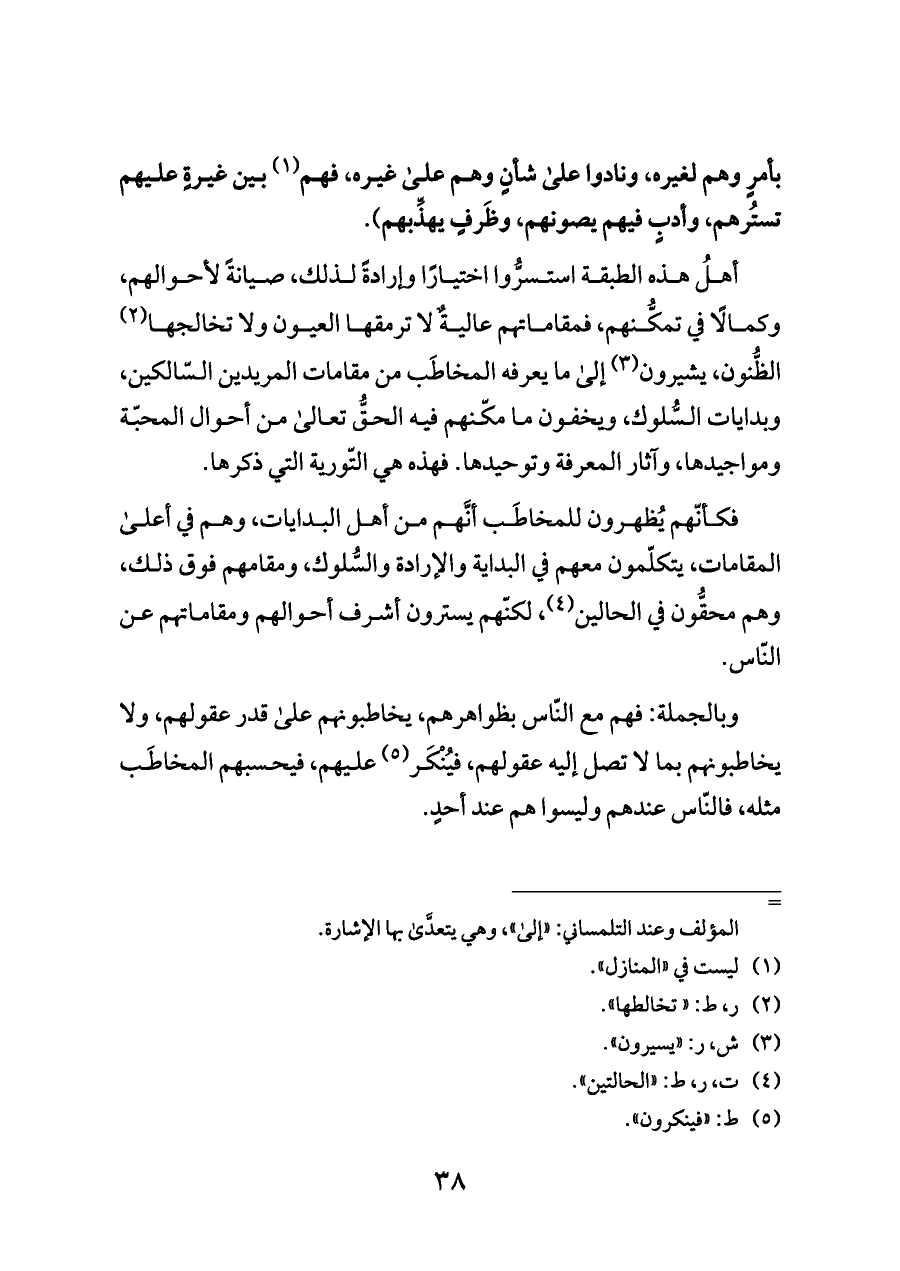 أهلُ هذه الطبقة استسرُّوا اختيارًا وإرادةً لذلك، صيانةً لأحوالهم، وكمالًا في تمكُّنهم، فمقاماتهم عاليةٌ لا ترمقها العيون ولا تخالجها (¬٢) الظُّنون، يشيرون (¬٣) إلى ما يعرفه المخاطَب من مقامات المريدين السّالكين، وبدايات السُّلوك، ويخفون ما مكّنهم فيه الحقُّ تعالى من أحوال المحبّة ومواجيدها، وآثار المعرفة وتوحيدها. فهذه هي التّورية التي ذكرها.