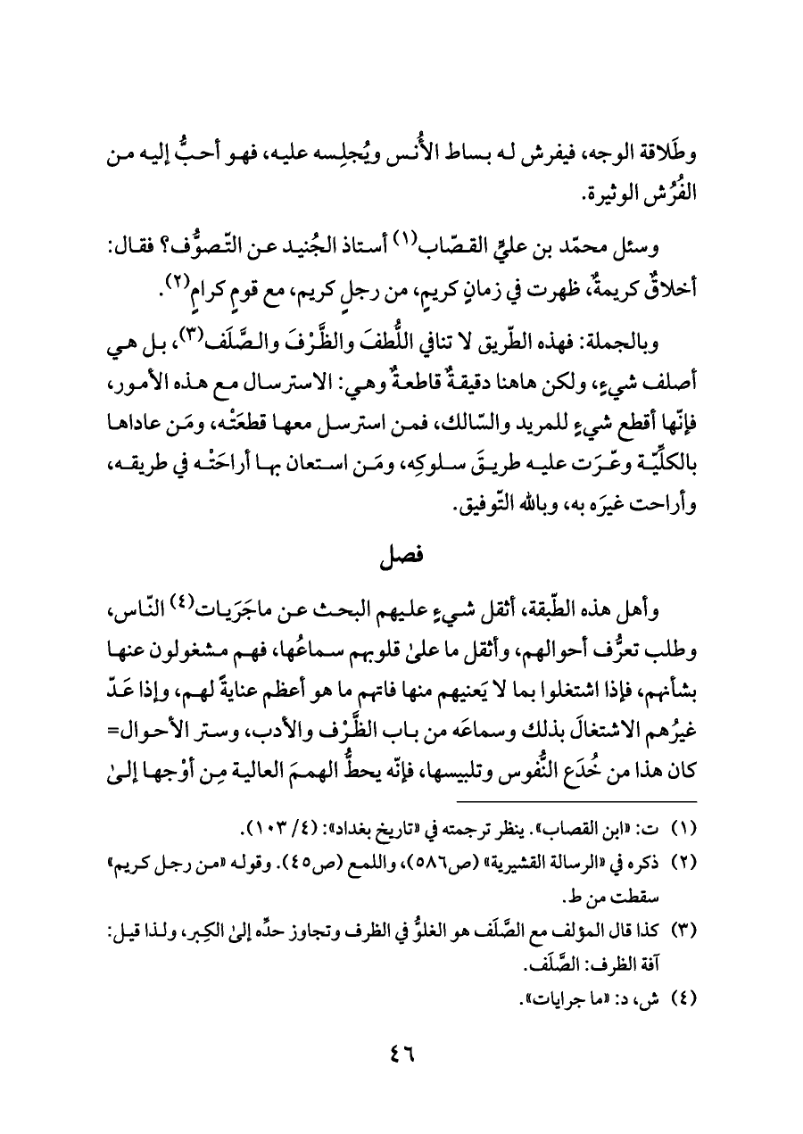 وسئل محمّد بن عليٍّ القصّاب (¬١) أستاذ الجُنيد عن التّصوُّف؟ فقال: أخلاقٌ كريمةٌ، ظهرت في زمانٍ كريمٍ، من رجلٍ كريم، مع قومٍ كرامٍ (¬٢).
