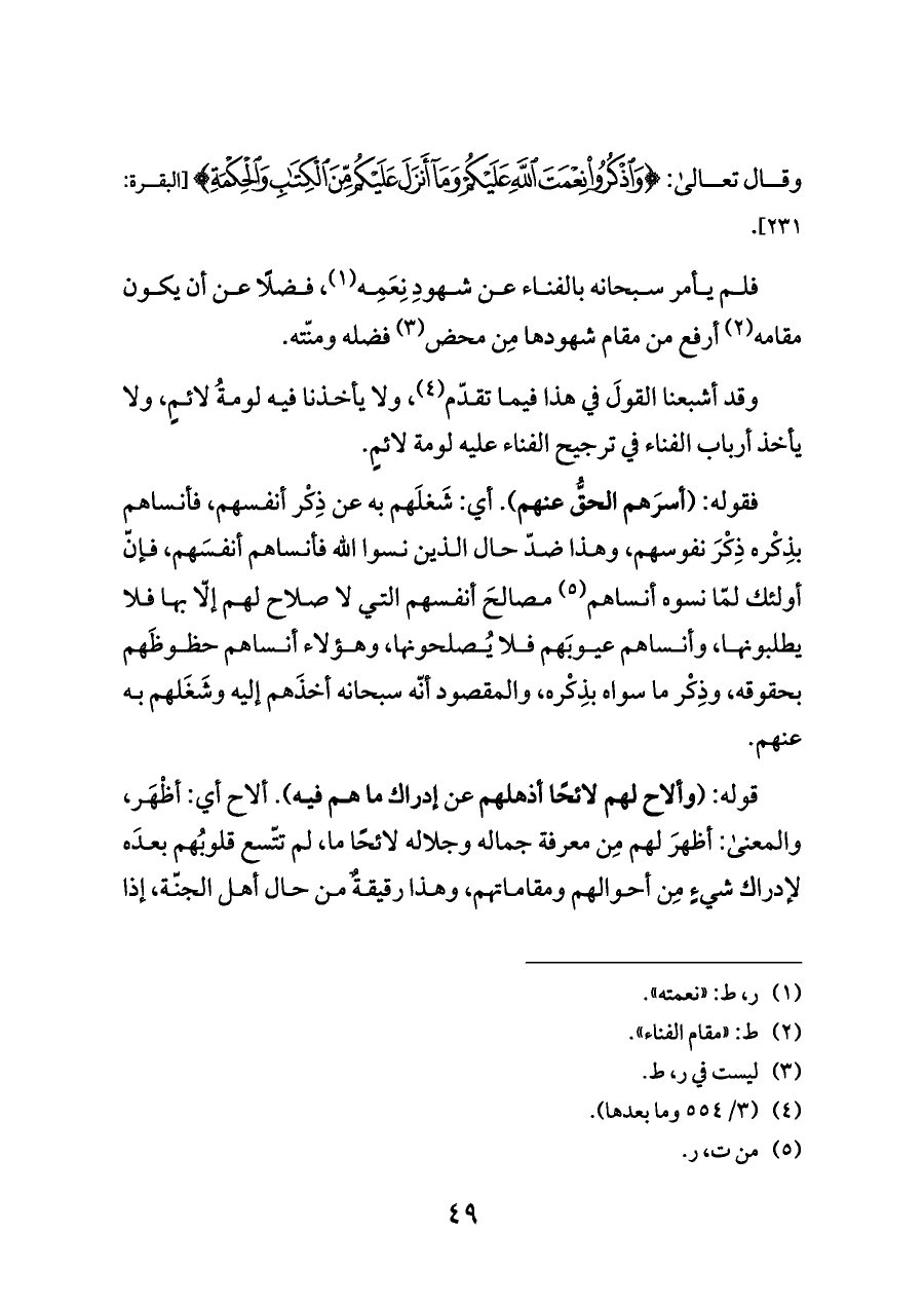 فقوله: (أسرَهم الحقُّ عنهم). أي: شَغلَهم به عن ذِكْر أنفسهم، فأنساهم بذِكْره ذِكْرَ نفوسهم، وهذا ضدّ حال الذين نسوا الله فأنساهم أنفسَهم، فإنّ أولئك لمّا نسوه أنساهم (¬٥) مصالحَ أنفسهم التي لا صلاح لهم إلّا بها فلا يطلبونها، وأنساهم عيوبَهم فلا يُصلحونها، وهؤلاء أنساهم حظوظَهم بحقوقه، وذِكْر ما سواه بذِكْره، والمقصود أنّه سبحانه أخذَهم إليه وشَغَلهم به عنهم.