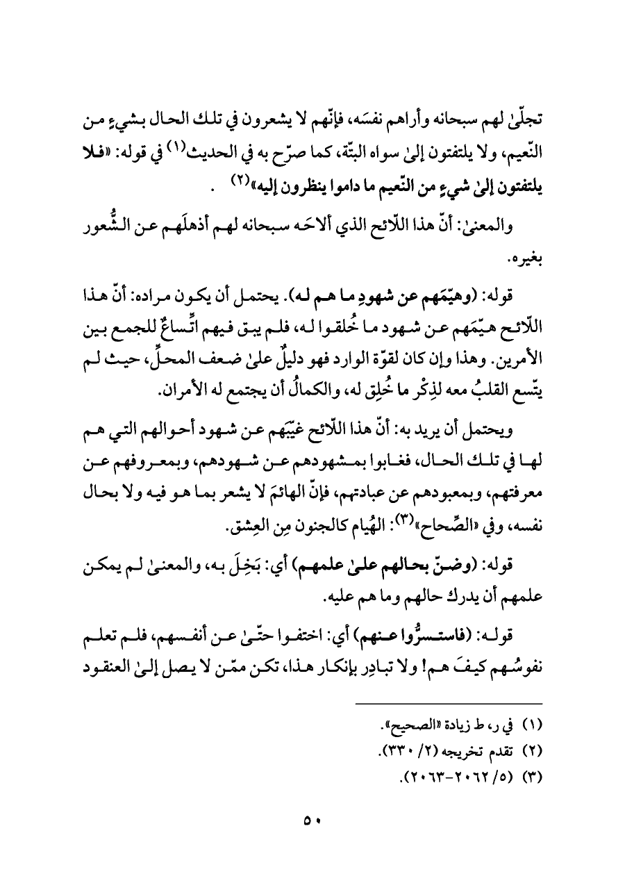 تجلّى لهم سبحانه وأراهم نفسَه، فإنّهم لا يشعرون في تلك الحال بشيءٍ من النّعيم، ولا يلتفتون إلى سواه البتّة، كما صرّح به في الحديث (¬١) في قوله: «فلا يلتفتون إلى شيءٍ من النّعيم ما داموا ينظرون إليه» (¬٢).