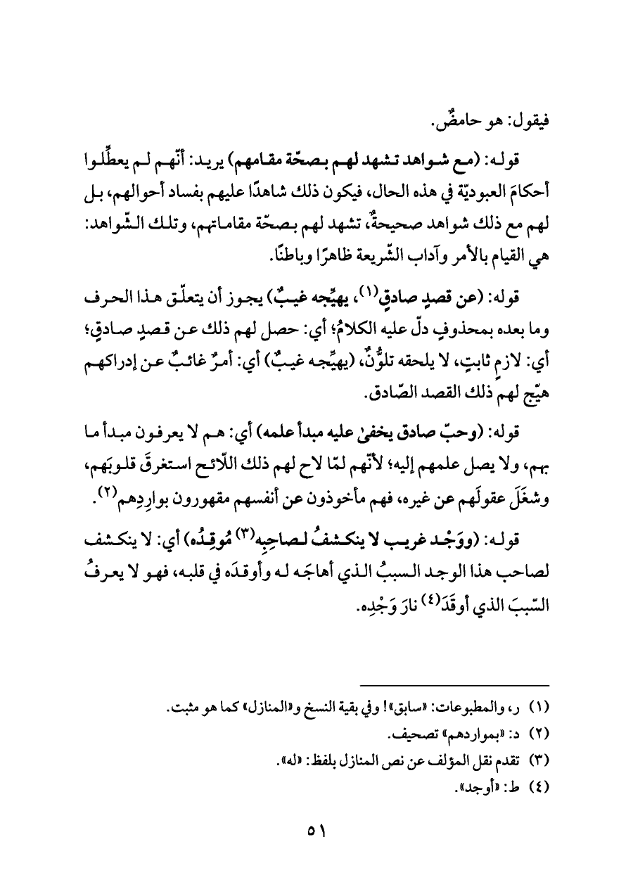 قوله: (مع شواهد تشهد لهم بصحّة مقامهم) يريد: أنّهم لم يعطِّلوا أحكامَ العبوديّة في هذه الحال، فيكون ذلك شاهدًا عليهم بفساد أحوالهم، بل لهم مع ذلك شواهد صحيحةٌ، تشهد لهم بصحّة مقاماتهم، وتلك الشّواهد: هي القيام بالأمر وآداب الشّريعة ظاهرًا وباطنًا.