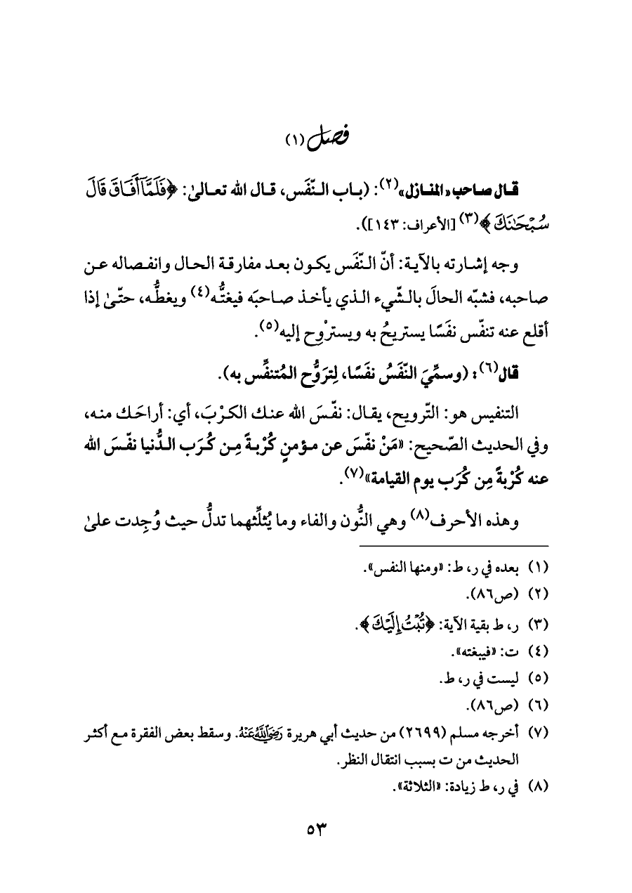 قال صاحب «المنازل» (¬٢): (باب النّفَس، قال الله تعالى: {فَلَمَّا أَفَاقَ قَالَ} (¬٣) [الأعراف: ١٤٣]).
