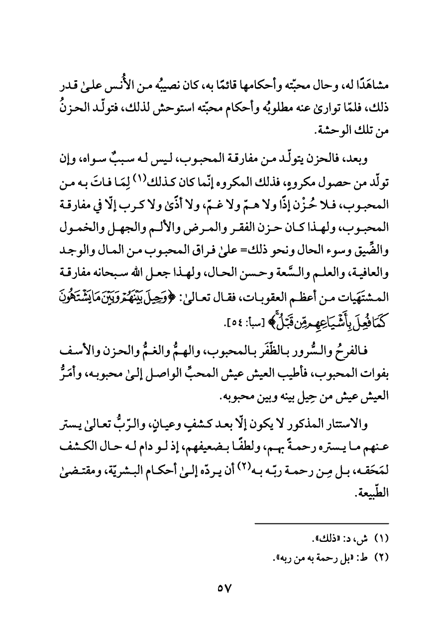 وبعد، فالحزن يتولّد من مفارقة المحبوب، ليس له سببٌ سواه، وإن تولّد من حصول مكروهٍ، فذلك المكروه إنّما كان كذلك (¬١) لِمَا فاتَ به من المحبوب، فلا حُزْن إذًا ولا همّ ولا غمّ، ولا أذًى ولا كرب إلّا في مفارقة المحبوب، ولهذا كان حزن الفقر والمرض والألم والجهل والخمول والضِّيق وسوء الحال ونحو ذلك= على فراق المحبوب من المال والوجد والعافية، والعلم والسَّعة وحسن الحال، ولهذا جعل الله سبحانه مفارقة المشتَهَيات من أعظم العقوبات، فقال تعالى: {وَحِيلَ بَيْنَهُمْ وَبَيْنَ مَا يَشْتَهُونَ كَمَا فُعِلَ بِأَشْيَاعِهِمْ مِنْ قَبْلُ} [سبأ: ٥٤].
