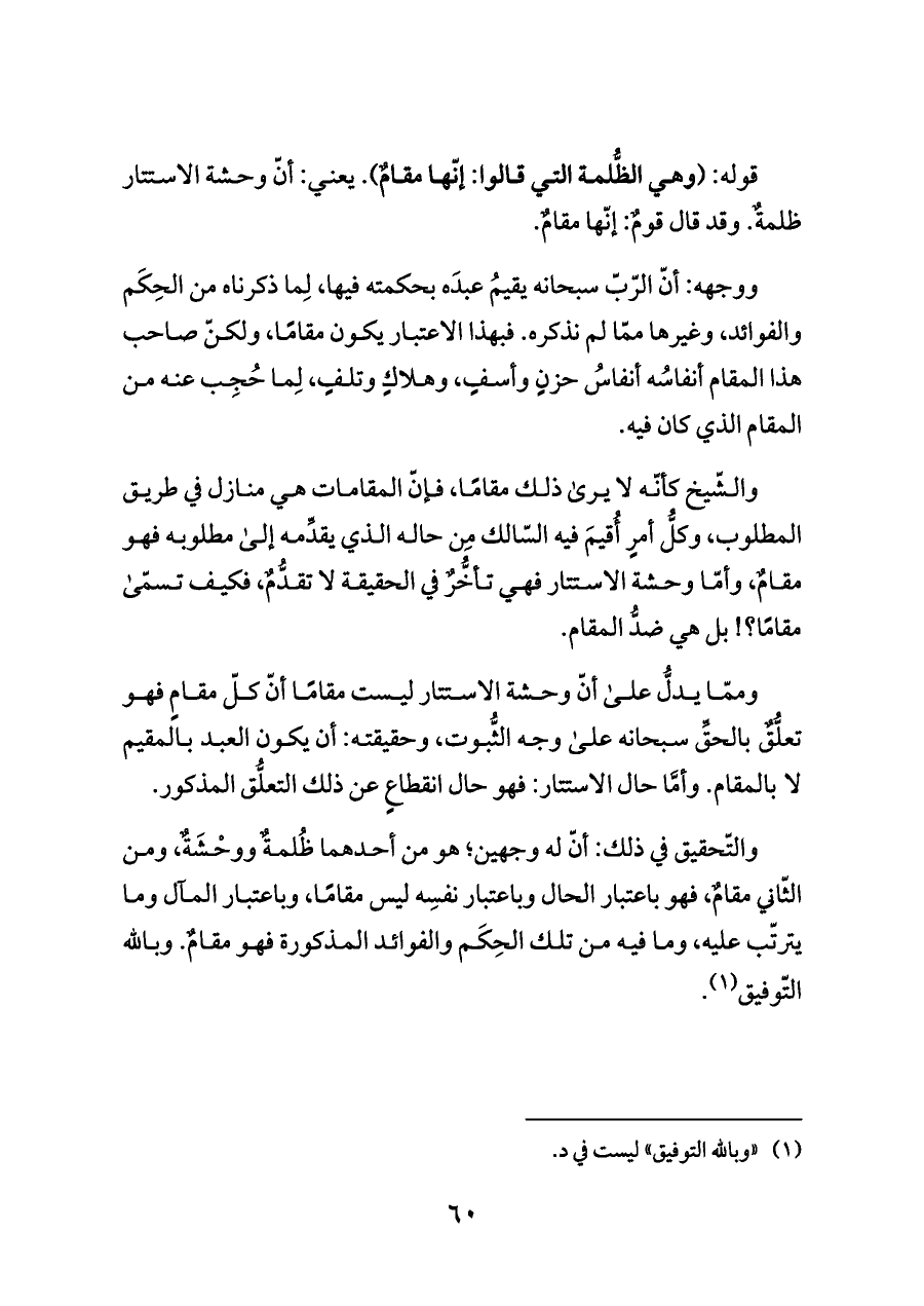 والشّيخ كأنّه لا يرى ذلك مقامًا، فإنّ المقامات هي منازل في طريق المطلوب، وكلُّ أمرٍ أُقيمَ فيه السّالك مِن حاله الذي يقدِّمه إلى مطلوبه فهو مقامٌ، وأمّا وحشة الاستتار فهي تأخُّرٌ في الحقيقة لا تقدُّمٌ، فكيف تسمّى مقامًا؟! بل هي ضدُّ المقام.