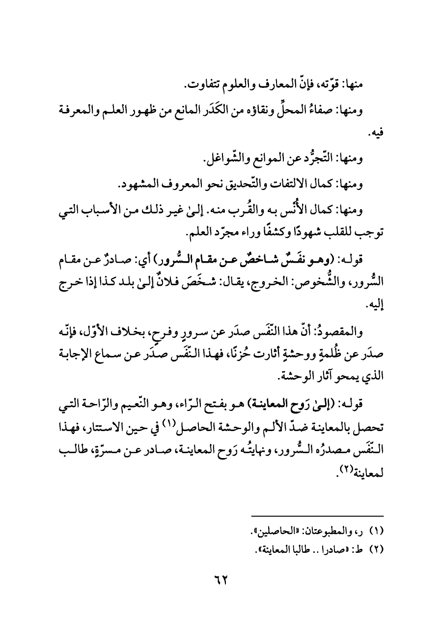 قوله: (إلى رَوح المعاينة) هو بفتح الرّاء، وهو النّعيم والرّاحة التي تحصل بالمعاينة ضدّ الألم والوحشة الحاصل (¬١) في حين الاستتار، فهذا النّفَس مصدرُه السُّرور، ونهايتُه رَوح المعاينة، صادر عن مسرّةٍ، طالب لمعاينة (¬٢).