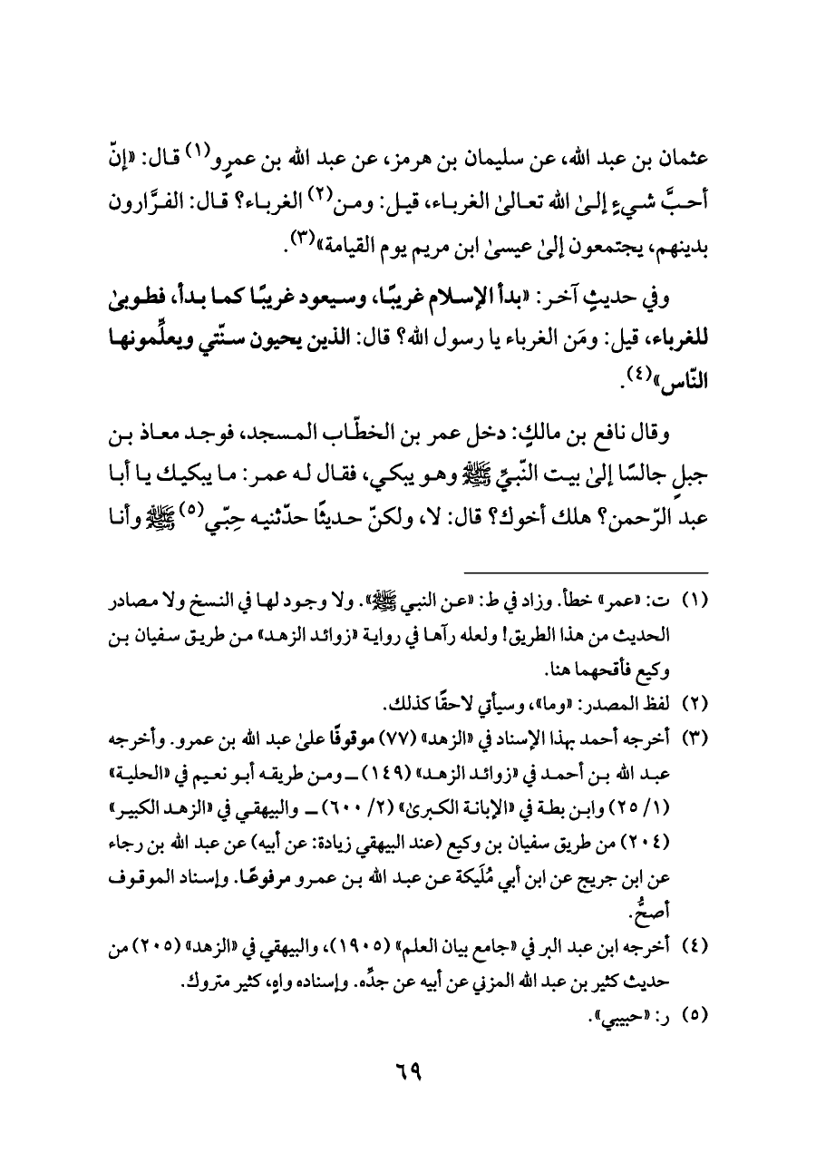 عثمان بن عبد الله، عن سليمان بن هرمز، عن عبد الله بن عمرٍو (¬١) قال: «إنّ أحبَّ شيءٍ إلى الله تعالى الغرباء، قيل: ومن (¬٢) الغرباء؟ قال: الفرَّارون بدينهم، يجتمعون إلى عيسى ابن مريم يوم القيامة» (¬٣).