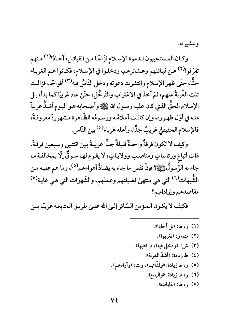 وكان المستجيبون لدعوة الإسلام نزّاعًا من القبائل، آحادًا (¬١) منهم تفرّقوا (¬٢) عن قبائلهم وعشائرهم، ودخلوا في الإسلام، فكانوا هم الغرباء حقًّا، حتّى ظهر الإسلام وانتشرت دعوته ودخل النّاسُ فيه (¬٣) أفواجًا، فزالت تلك الغُربةُ عنهم، ثمّ أخذ في الاغتراب والتّرحُّل، حتّى عاد غريبًا كما بدأ، بل الإسلام الحقُّ الذي كان عليه رسول الله - صلى الله عليه وسلم - وأصحابه هو اليوم أشدُّ غربةً منه في أوّل ظهوره، وإن كانت أعلامُه ورسومُه الظّاهرة مشهورةً معروفةً، فالإسلام الحقيقيُّ غريبٌ جدًّا، وأهله غرباء (¬٤) بين النّاس.