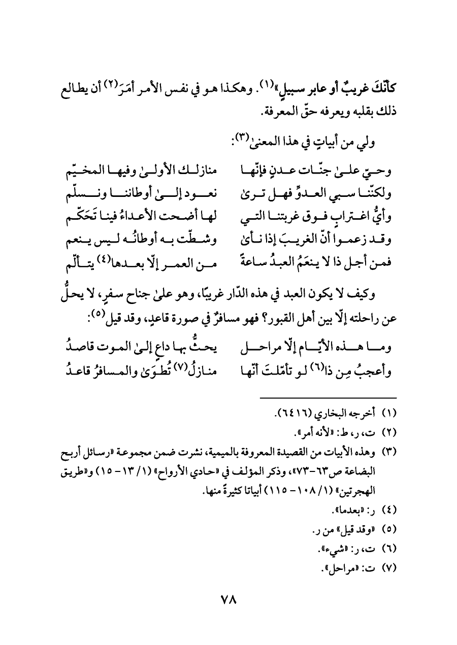 كأنّكَ غريبٌ أو عابر سبيلٍ» (¬١). وهكذا هو في نفس الأمر أمَرَ (¬٢) أن يطالع ذلك بقلبه ويعرفه حقّ المعرفة.