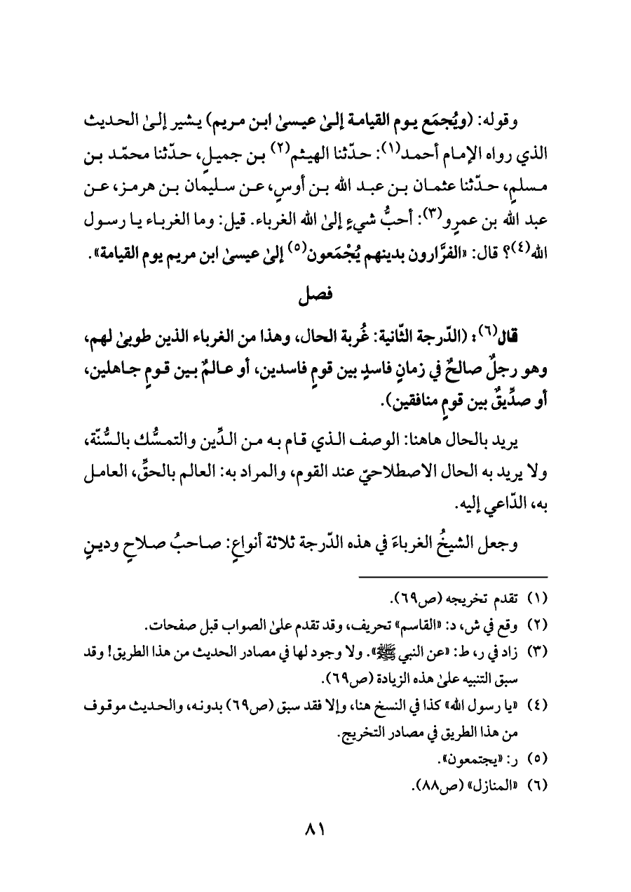 وقوله: (ويُجمَع يوم القيامة إلى عيسى ابن مريم) يشير إلى الحديث الذي رواه الإمام أحمد (¬١): حدّثنا الهيثم (¬٢) بن جميلٍ، حدّثنا محمّد بن مسلمٍ، حدّثنا عثمان بن عبد الله بن أوسٍ، عن سليمان بن هرمز، عن عبد الله بن عمرٍو (¬٣): أحبُّ شيءٍ إلى الله الغرباء. قيل: وما الغرباء يا رسول الله (¬٤)؟ قال: «الفرَّارون بدينهم يُجْمَعون (¬٥) إلى عيسى ابن مريم يوم القيامة».