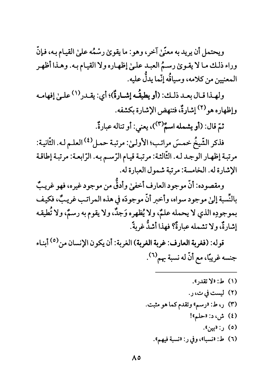 فذكر الشّيخُ خمسَ مراتب؛ الأولى: مرتبة حمل (¬٤) العلم له. الثّانية: مرتبة إظهار الوجد له. الثّالثة: مرتبة قيام الرّسم به. الرّابعة: مرتبة إطاقة الإشارة له. الخامسة: مرتبة شمول العبارة له.