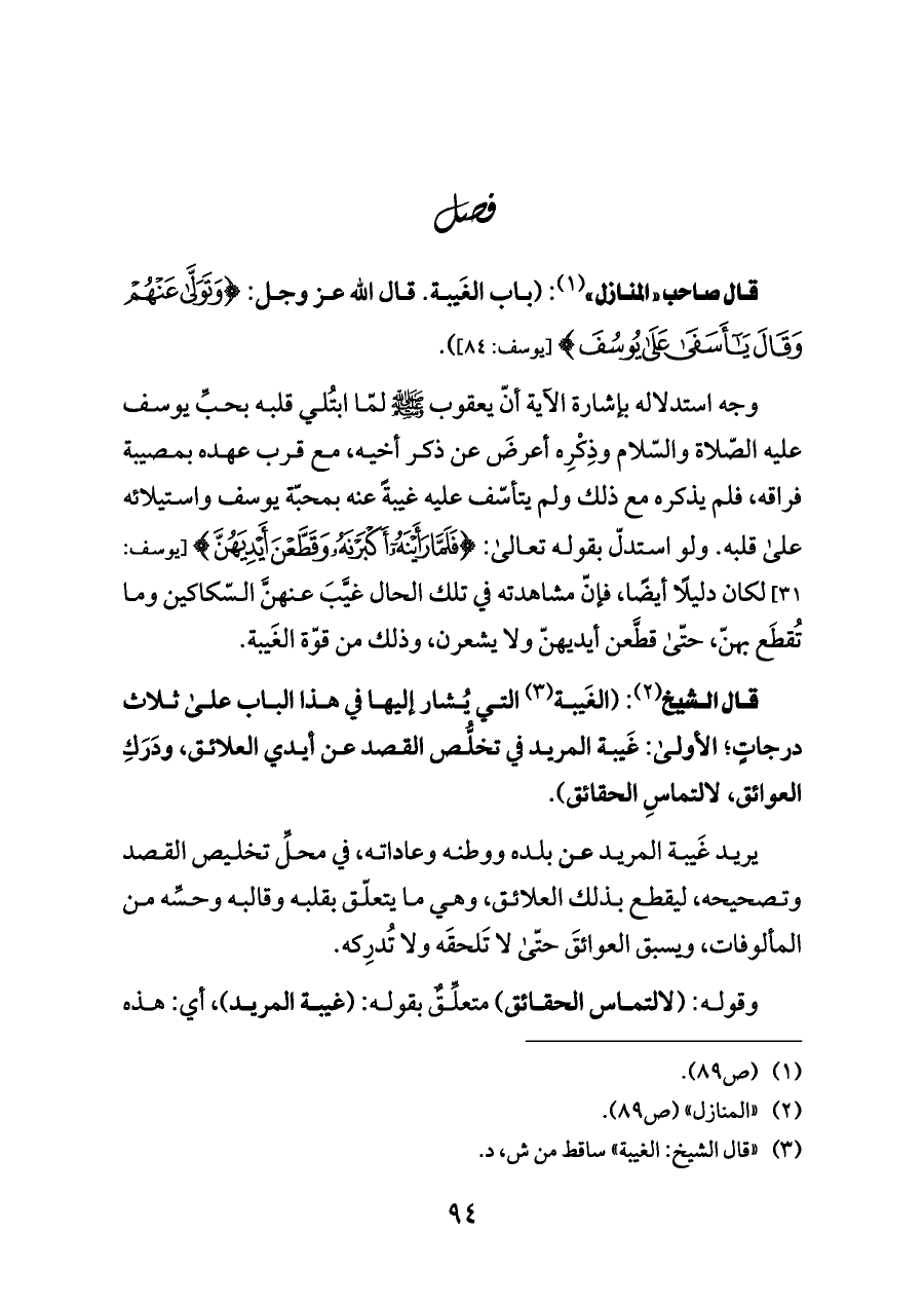 قال صاحب «المنازل» (¬١): (باب الغَيبة. قال الله عز وجل: {وَتَوَلَّى عَنْهُمْ وَقَالَ يَاأَسَفَا عَلَى يُوسُفَ} [يوسف: ٨٤]).