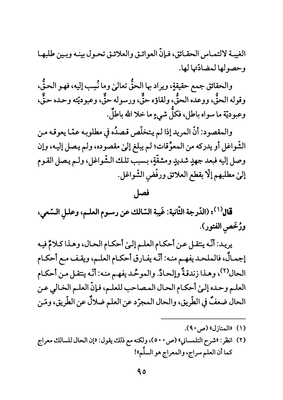 قال (¬١): (الدّرجة الثّانية: غَيبة السّالك عن رسوم العلم، وعللِ السّعي، ورُخَصِ الفتور).