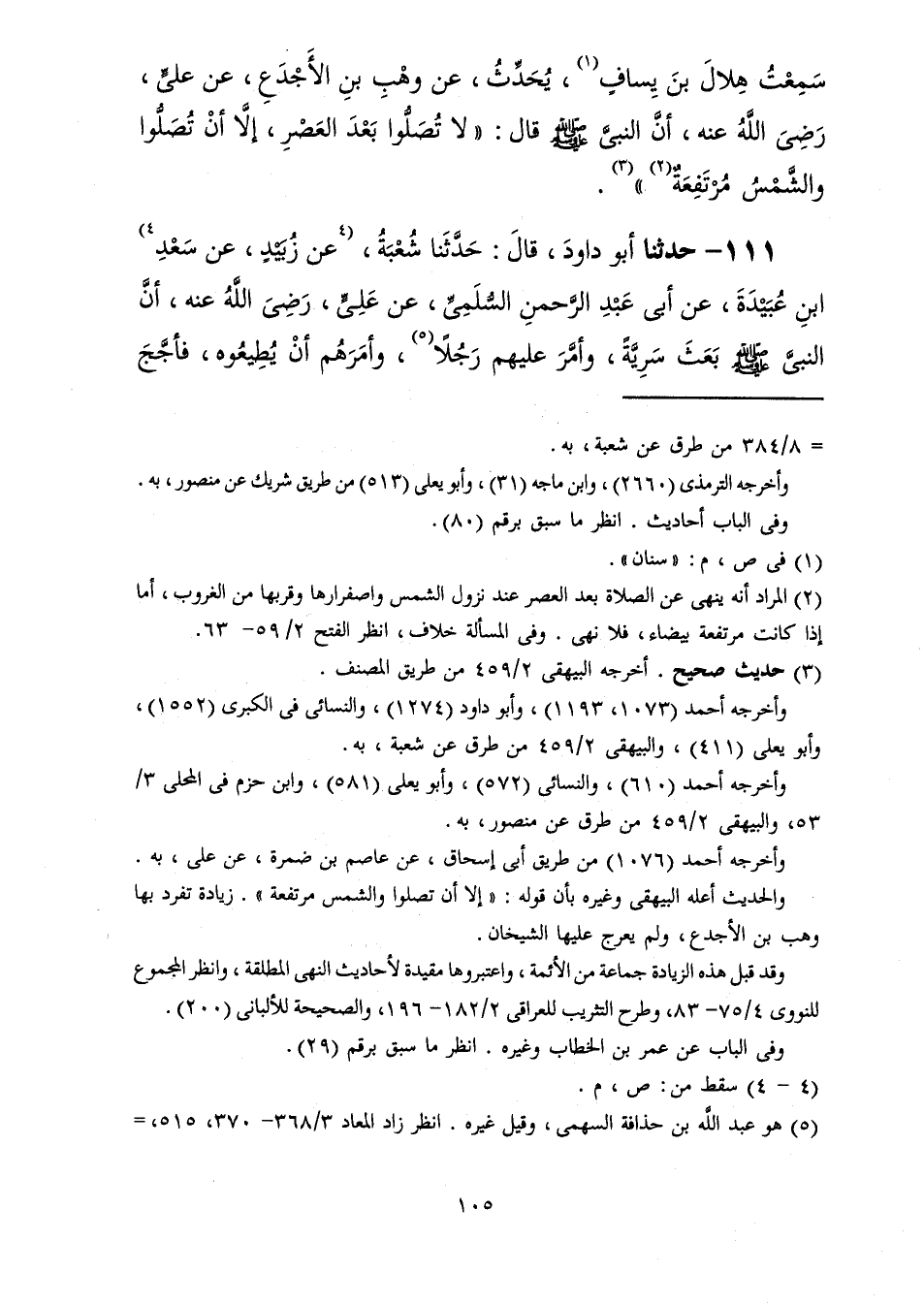 111 - حَدَّثَنَا أَبُو دَاوُدَ قَالَ: حَدَّثَنَا شُعْبَةُ عَنْ زُبَيْدٍ عَنْ سَعْدِ بْنُ عُبَيْدَةَ، عَنْ أَبِي عَبْدِ الرَّحْمَنِ السُّلَمِيِّ، عَنْ عَلِيٍّ رَضِيَ اللَّهُ عَنْهُ، أَنَّ النَّبِيَّ صَلَّى اللهُ عَلَيْهِ وَسَلَّمَ بَعَثَ سَرِيَّةً وَأَمَّرَ عَلَيْهِمْ رَجُلًا وَأَمَرَهُمْ أَنْ يُطِيعُوهُ فَأَجَّجَ -[106]- لَهُمْ نَارًا وَأَمَرَهُمْ أَنْ يَقْتَحِمُوهَا فَهَمَّ قَوْمٌ أَنْ يَفْعَلُوا وَقَالَ آخَرُونَ: إِنَّمَا فَرَرْنَا مِنَ النَّارِ فَأَبَوْا ثُمَّ قَدِمُوا عَلَى رَسُولِ اللَّهِ صَلَّى اللهُ عَلَيْهِ وَسَلَّمَ فَذُكِرَ ذَلِكَ لَهُ فَقَالَ رَسُولُ اللَّهِ صَلَّى اللهُ عَلَيْهِ وَسَلَّمَ: «§لَوْ دَخَلُوهَا لَمْ يَزَالُوا فِيهَا إِلَى يَوْمِ الْقِيَامَةِ لَا طَاعَةَ لِبَشَرٍ فِي مَعْصِيَةِ اللَّهِ عَزَّ وَجَلَّ إِنَّمَا الطَّاعَةُ فِي الْمَعْرُوفِ»