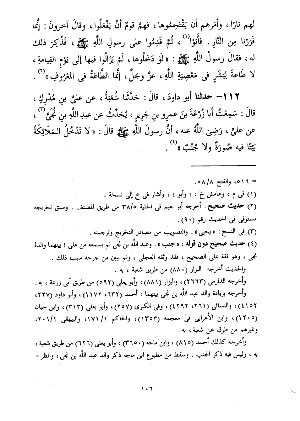 112 - حَدَّثَنَا أَبُو دَاوُدَ قَالَ: حَدَّثَنَا شُعْبَةُ، عَنْ عَلِيِّ بْنِ مُدْرِكٍ، قَالَ: سَمِعْتُ أَبَا زُرْعَةَ بْنَ عَمْرِو بْنِ جَرِيرٍ، يُحَدِّثُ عَنْ عَبْدِ اللَّهِ بْنِ نُجَيٍّ، عَنْ عَلِيٍّ رَضِيَ اللَّهُ عَنْهُ، أَنَّ رَسُولَ اللَّهِ صَلَّى اللهُ عَلَيْهِ وَسَلَّمَ قَالَ: «§لَا تَدْخُلُ الْمَلَائِكَةُ بَيْتًا فِيهِ صُورَةٌ وَلَا جُنُبٌ»