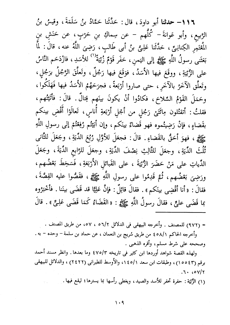 116 - حَدَّثَنَا أَبُو دَاوُدَ قَالَ: حَدَّثَنَا حَمَّادُ بْنُ سَلَمَةَ، وَقَيْسُ بْنُ الرَّبِيعِ، وَأَبُو عَوَانَةَ كُلُّهُمْ عَنْ سِمَاكِ بْنِ حَرْبٍ، عَنِ حَنَشِ بْنِ الْمُعْتَمِرِ الْكِنَانِيِّ، حَدَّثَنَا عَلِيُّ بْنُ أَبِي طَالِبٍ رَضِيَ اللَّهُ عَنْهُ، قَالَ: لَمَّا بَعَثَنِي رَسُولُ اللَّهِ صَلَّى اللهُ عَلَيْهِ وَسَلَّمَ إِلَى الْيَمَنِ §حَفَرَ قَوْمٌ زُبْيَةً لِلْأَسَدِ فَازْدَحَمَ النَّاسُ عَلَى الزُّبْيَةِ وَوَقَعَ فِيهَا الْأَسَدُ فَوَقَعَ فِيهَا رَجُلٌ وَتَعَلَّقَ الرَّجُلُ بِرَجُلٍ وَتَعَلَّقَ الْآخَرُ بِالْآخَرِ حَتَّى صَارُوا أَرْبَعَةً فَجَرَحَهُمُ الْأَسَدُ فِيهَا فَهَلَكُوا وَحَمَلَ الْقَوْمُ السِّلَاحَ فَكَادُوا أَنْ يَكُونَ بَيْنَهُمْ قِتَالٌ، قَالَ: فَأَتَيْتُهُمْ فَقُلْتُ: أَتَقْتُلُونَ مِائَتَيْ رَجُلٍ مِنْ أَجْلِ أَرْبَعَةِ أُنَاسٍ تَعَالَوْا أَقْضِ بَيْنَكُمْ بِقَضَاءٍ فَإِنْ رَضِيتُمُوهُ فَهُوَ قَضَاءٌ بَيْنَكُمْ وَإِنْ أَبَيْتُمْ رُفِعْتُمْ إِلَى رَسُولِ اللَّهِ صَلَّى اللهُ عَلَيْهِ وَسَلَّمَ فَهُوَ أَحَقُّ بِالْقَضَاءِ قَالَ: فَجَعَلَ لِلْأَوَّلِ رُبُعَ الدِّيَةِ وَجَعَلَ لِلثَّانِي ثُلُثَ الدِّيَةِ وَجَعَلَ لِلثَّالِثِ نِصْفَ الدِّيَةِ وَجَعَلَ لِلرَّابِعِ الدِّيَةَ وَجَعَلَ الدِّيَاتِ عَلَى مَنْ حَضَرَ الزُّبْيَةَ عَلَى الْقَبَائِلِ الْأَرْبَعَةِ فَسَخِطَ بَعْضُهُمْ وَرَضِيَ بَعْضُهُمْ ثُمَّ قَدِمُوا عَلَى رَسُولِ اللَّهِ صَلَّى اللهُ عَلَيْهِ وَسَلَّمَ فَقَصُّوا عَلَيْهِ الْقِصَّةَ فَقَالَ: «أَنَا أَقْضِي بَيْنَكُمْ» ، فَقَالَ قَائِلٌ: فَإِنَّ عَلِيًّا قَدْ قَضَى بَيْنَنَا فَأَخْبَرُوهُ بِمَا قَضَى عَلِيٌّ فَقَالَ رَسُولُ اللَّهِ صَلَّى اللهُ عَلَيْهِ وَسَلَّمَ: «الْقَضَاءُ كَمَا قَضَى عَلِيٌّ» قَالَ -[110]- هَذَا: حَمَّادٌ وَقَالَ قَيْسٌ: فَأَمْضَى رَسُولُ اللَّهِ صَلَّى اللهُ عَلَيْهِ وَسَلَّمَ قَضَاءَ عَلِيٍّ