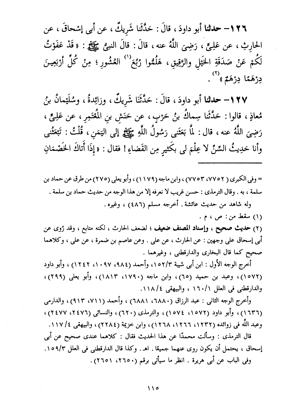 126 - حَدَّثَنَا أَبُو دَاوُدَ قَالَ حَدَّثَنَا شَرِيكٌ، عَنْ أَبِي إِسْحَاقَ، عَنِ الْحَارِثِ، عَنْ عَلِيٍّ رَضِيَ اللَّهُ عَنْهُ قَالَ: قَالَ النَّبِيُّ صَلَّى اللهُ عَلَيْهِ وَسَلَّمَ: «قَدْ §عَفَوْتُ لَكُمْ عَنْ صَدَقَةِ الْخَيْلِ وَالرَّقِيقِ هَلُمُّوا رُبُعَ الْعُشُورِ مِنْ كُلِّ أَرْبَعِينَ دِرْهَمًا دِرْهَمٌ»