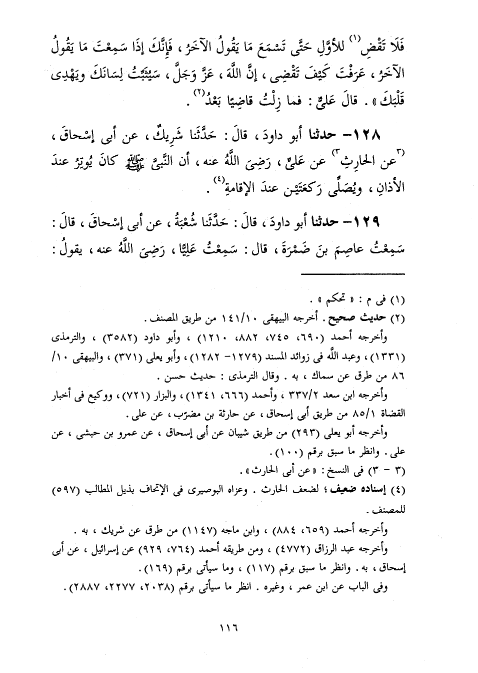 128 - حَدَّثَنَا أَبُو دَاوُدَ قَالَ: حَدَّثَنَا شَرِيكٌ، عَنْ أَبِي إِسْحَاقَ، عَنْ الْحَارِثِ، عَنْ عَلِيٍّ رَضِيَ اللَّهُ عَنْهُ، أَنَّ النَّبِيَّ صَلَّى اللهُ عَلَيْهِ وَسَلَّمَ «كَانَ §يُوتِرُ عِنْدَ الْأَذَانِ وَيُصَلِّي رَكْعَتَيْنِ عِنْدَ الْإِقَامَةِ»