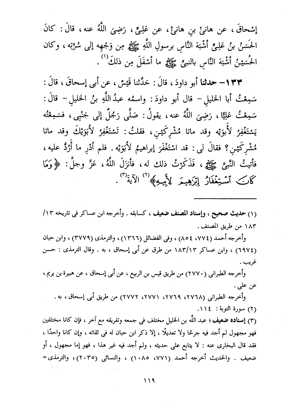 133 - حَدَّثَنَا أَبُو دَاوُدَ قَالَ: حَدَّثَنَا قَيْسٌ، عَنْ أَبِي إِسْحَاقَ، قَالَ: سَمِعْتُ أَبَا الْخَلِيلِ، قَالَ أَبُو دَاوُدَ وَاسْمُهُ عَبْدُ اللَّهِ بْنُ الْخَلِيلِ قَالَ: سَمِعْتُ عَلِيًّا رَضِيَ اللَّهُ عَنْهُ، يَقُولُ: «صَلَّى رَجُلٌ إِلَى جَنْبِي §فَسَمِعْتُهُ يَسْتَغْفِرُ لِأَبَوَيْهِ وَقَدْ مَاتَا مُشْرِكِينَ» فَقُلْتُ: «تَسْتَغْفِرُ لِأَبَوَيْكَ وَقَدْ مَاتَا مُشْرِكِينَ؟» فَقَالَ لِي: قَدِ اسْتَغْفَرَ إِبْرَاهِيمُ لِأَبَوَيْهِ فَلَمْ أَدْرِ مَا أَرُدُّ عَلَيْهِ فَأَتَيْتُ النَّبِيَّ صَلَّى اللهُ عَلَيْهِ وَسَلَّمَ فَذَكَرْتُ ذَلِكَ لَهُ فَأَنْزَلَ اللَّهُ عَزَّ وَجَلَّ {وَمَا كَانَ اسْتِغْفَارُ إِبْرَاهِيمَ لِأَبِيهِ} [التوبة: 114] الْآيَةَ