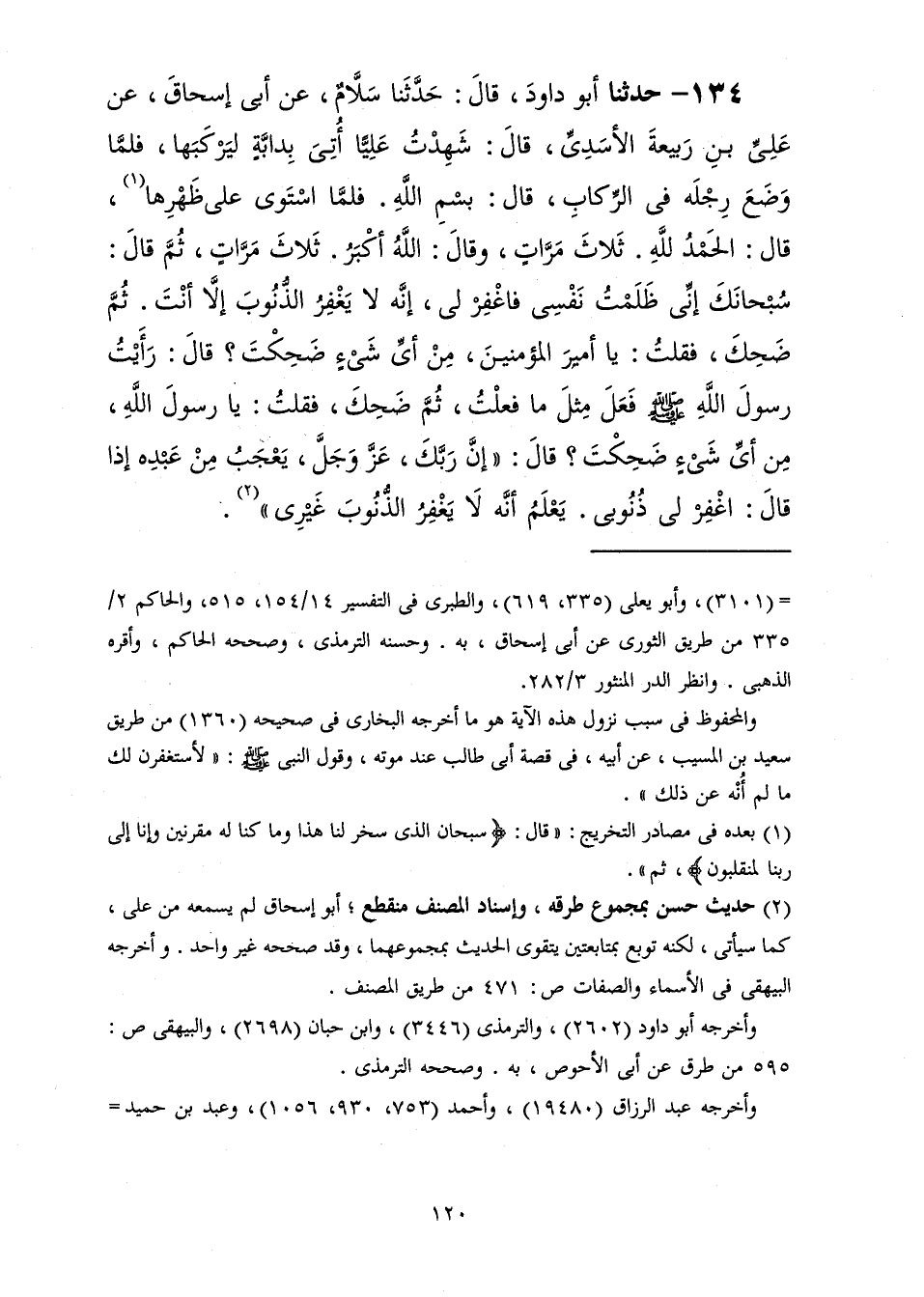 134 - حَدَّثَنَا أَبُو دَاوُدَ قَالَ: حَدَّثَنَا سَلَّامٌ، عَنْ أَبِي إِسْحَاقَ، عَنْ عَلِيِّ بْنِ رَبِيعَةَ الْأَسَدِيِّ، قَالَ: شَهِدْتُ عَلِيًّا أُتِيَ بِدَابَّةٍ لِيَرْكَبَهَا فَلَمَّا وَضَعَ رِجْلَهُ فِي الرِّكَابِ قَالَ: بِسْمِ اللَّهِ فَلَمَّا اسْتَوَى عَلَى ظَهْرِهَا قَالَ: الْحَمْدُ لِلَّهِ ثَلَاثَ مَرَّاتٍ وَقَالَ اللَّهُ أَكْبَرَ ثَلَاثَ مَرَّاتٍ ثُمَّ قَالَ: سُبْحَانَكَ إِنِّي ظَلَمْتُ نَفْسِي فَاغْفِرْ لِي إِنَّهُ لَا يَغْفِرُ الذُّنُوبَ إِلَّا أَنْتَ ثُمَّ ضَحِكَ فَقُلْتُ: يَا أَمِيرَ الْمُؤْمِنِينَ مِنْ أَيِّ شَيْءٍ ضَحِكْتَ؟ قَالَ رَأَيْتُ رَسُولَ اللَّهِ صَلَّى اللهُ عَلَيْهِ وَسَلَّمَ فَعَلَ مِثْلَ مَا فَعَلْتُ ثُمَّ ضَحِكَ فَقُلْتُ: يَا رَسُولَ اللَّهِ صَلَّى اللهُ عَلَيْهِ وَسَلَّمَ مِنْ أَيِّ شَيْءٍ ضَحِكْتَ؟ قَالَ: " إِنَّ §رَبَّكَ عَزَّ وَجَلَّ يَعْجَبُ مِنْ عَبْدِهِ إِذَا قَالَ: اغْفِرْ لِي ذُنُوبِي يَعْلَمُ أَنَّهُ لَا يَغْفِرُ الذُّنُوبَ غَيْرِي "