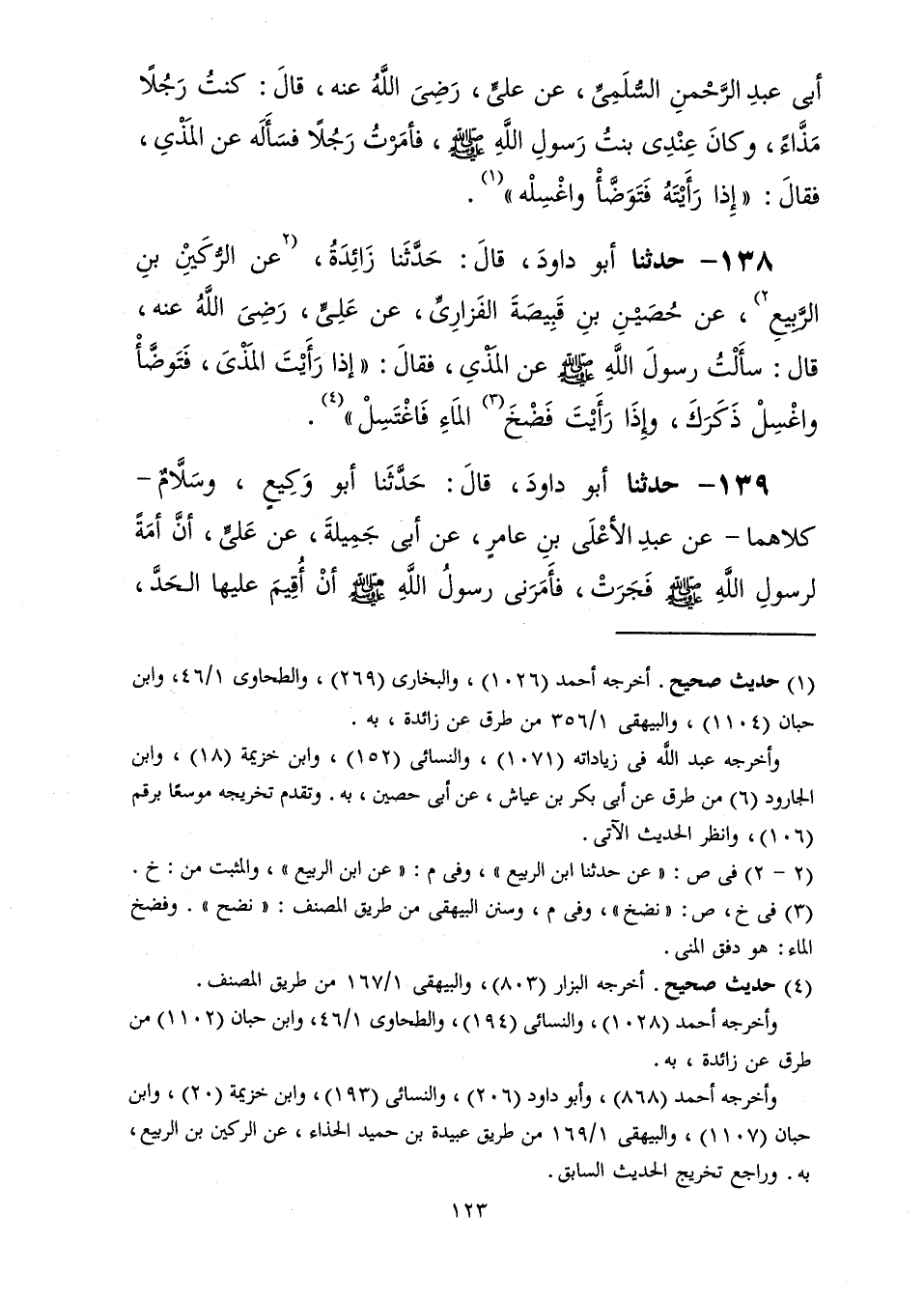 138 - حَدَّثَنَا أَبُو دَاوُدَ قَالَ: حَدَّثَنَا زَائِدَةُ، عَنِ الرُّكَيْنِ بْنِ الرَّبِيعِ، عَنْ حُصَيْنِ بْنِ قَبِيصَةَ الْفَزَارِيِّ، عَنْ عَلِيٍّ رَضِيَ اللَّهُ عَنْهُ، قَالَ: سَأَلْتُ رَسُولَ اللَّهِ صَلَّى اللهُ عَلَيْهِ وَسَلَّمَ عَنِ الْمَذْيِ فَقَالَ: «§إِذَا رَأَيْتَ الْمَذْيَ فَتَوَضَّأْ وَاغْسِلْ ذَكَرَكَ وَإِذَا رَأَيْتَ فَضْخَ الْمَاءِ فَاغْتَسِلْ»