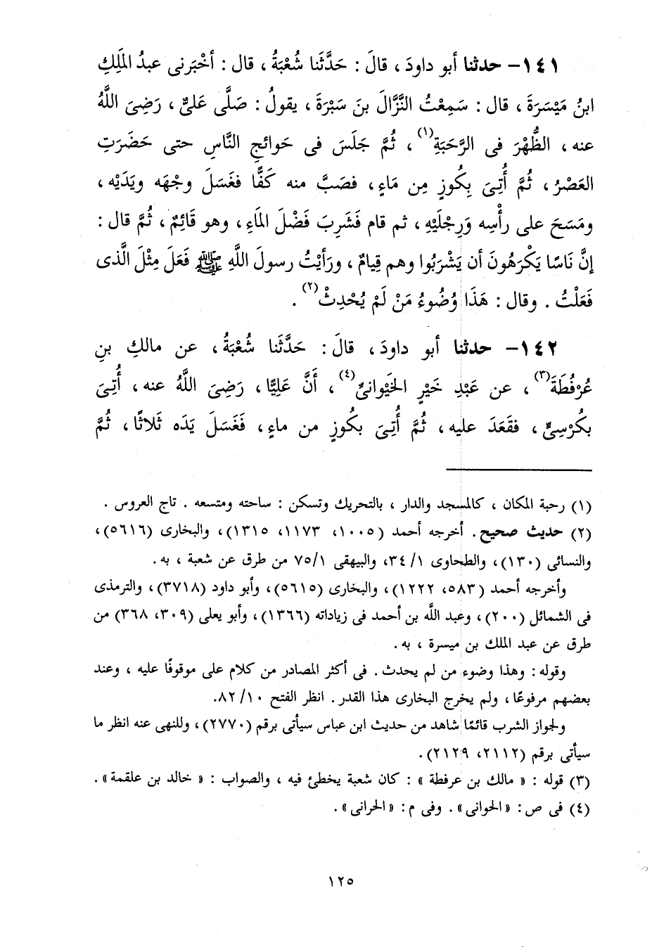141 - حَدَّثَنَا أَبُو دَاوُدَ قَالَ: حَدَّثَنَا شُعْبَةُ، قَالَ: أَخْبَرَنِي عَبْدُ الْمَلِكِ بْنُ مَيْسَرَةَ، قَالَ: سَمِعْتُ النَّزَّالَ بْنَ سَبْرَةَ، يَقُولُ: صَلَّى عَلِيٌّ رَضِيَ اللَّهُ عَنْهُ الظُّهْرَ فِي الرَّحَبَةِ ثُمَّ جَلَسَ فِي حَوَائِجِ النَّاسِ حَتَّى حَضَرَتِ الْعَصْرُ ثُمَّ أُتِيَ بِكُوزٍ مِنْ مَاءٍ فَصَبَّ مِنْهُ كَفًّا فَغَسَلَ وَجْهَهُ وَيَدَيْهِ وَمَسَحَ عَلَى رَأْسِهِ وَرِجْلَيْهِ ثُمَّ قَامَ فَشَرِبَ فَضْلَ الْمَاءِ وَهُوَ قَائِمٌ ثُمَّ قَالَ: إِنَّ نَاسًا يَكْرَهُونَ أَنْ يَشْرَبُوا وَهُمْ قِيَامٌ وَرَأَيْتُ رَسُولَ اللَّهِ صَلَّى اللهُ عَلَيْهِ وَسَلَّمَ فَعَلَ مِثْلَ الَّذِي فَعَلْتُ وَقَالَ: «§هَذَا وُضُوءُ مَنْ لَمْ يُحْدِثْ»