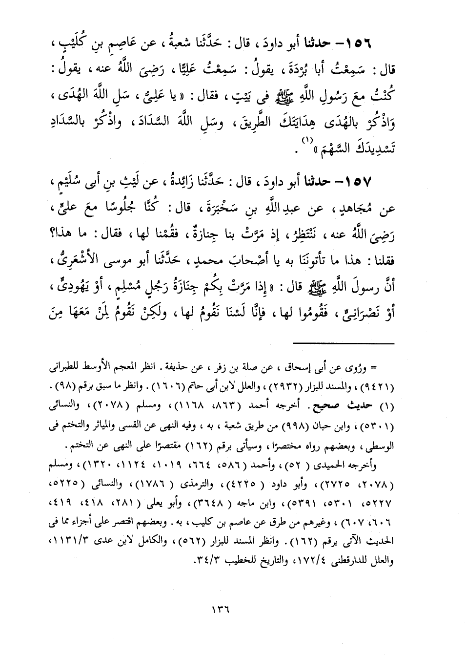 156 - حَدَّثَنَا أَبُو دَاوُدَ قَالَ: حَدَّثَنَا شُعْبَةُ، عَنْ عَاصِمِ بْنِ كُلَيْبٍ، قَالَ: سَمِعْتُ أَبَا بُرْدَةَ، يَقُولُ: سَمِعْتُ عَلِيًّا رَضِيَ اللَّهُ عَنْهُ، يَقُولُ: كُنْتُ مَعَ رَسُولِ اللَّهِ صَلَّى اللهُ عَلَيْهِ وَسَلَّمَ فِي بَيْتٍ فَقَالَ: «يَا عَلِيُّ §سَلِ اللَّهَ الْهُدَى وَاذْكُرْ بِالْهُدَى هِدَايَتَكَ الطَّرِيقَ وَسَلِ اللَّهَ السَّدَادَ وَاذْكُرْ بِالسَّدَادِ تَسْدِيدَكَ السَّهْمَ»