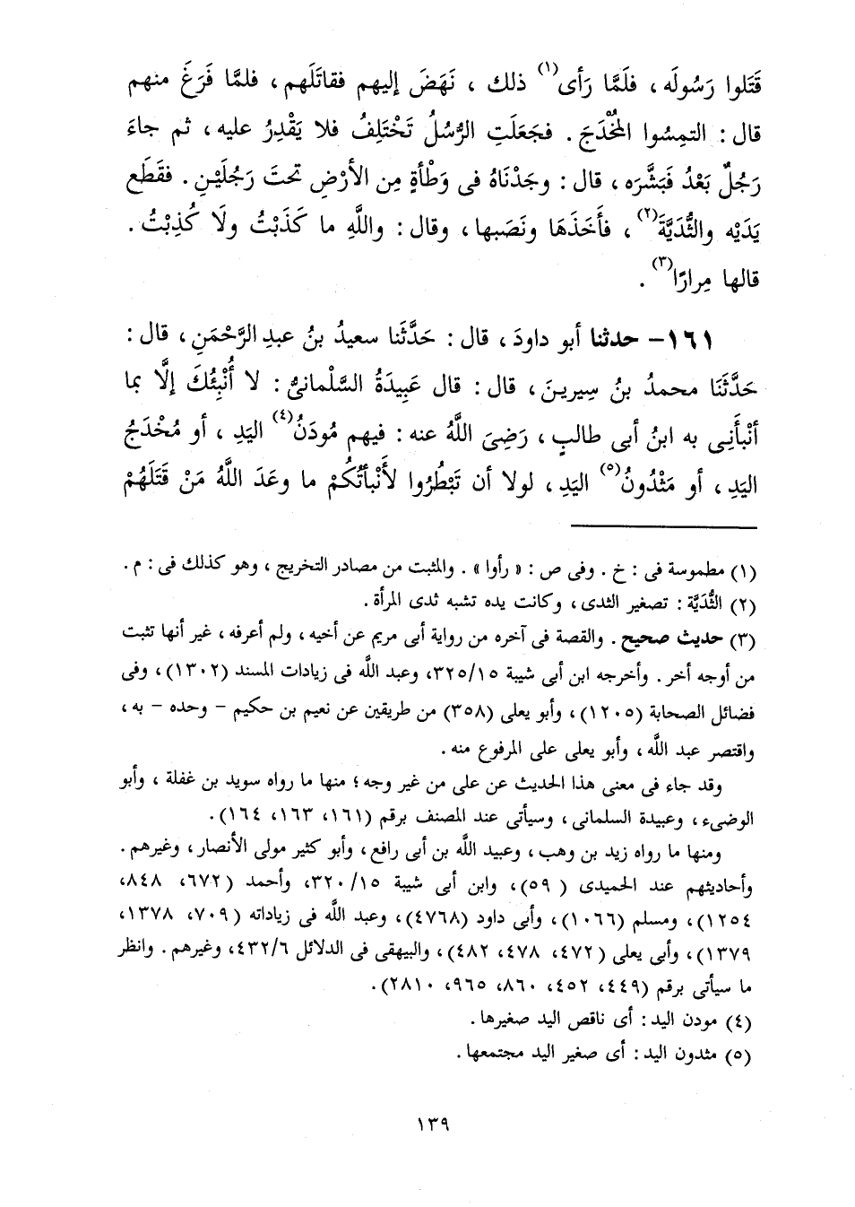 161 - حَدَّثَنَا أَبُو دَاوُدَ قَالَ: حَدَّثَنَا سَعِيدُ بْنُ عَبْدِ الرَّحْمَنِ، قَالَ: حَدَّثَنَا مُحَمَّدُ بْنُ سِيرِينَ، قَالَ: قَالَ عَبِيدَةُ السَّلْمَانِيُّ: لَا أُنَبِّئُكَ إِلَّا بِمَا أَنْبَأَنِي بِهِ ابْنُ أَبِي طَالِبٍ رَضِيَ اللَّهُ عَنْهُ: «§فِيهِمْ مُودَنُ الْيَدِ أَوْ مُخْدَجُ الْيَدِ أَوْ مَثْدُونُ الْيَدِ لَوْلَا أَنْ تَبْطُرُوا لَأَنْبَأْتُكُمْ مَا وَعَدَ اللَّهُ مَنْ قَتَلَهُمْ -[140]- عَلَى لِسَانِ نَبِيِّهِ صَلَّى اللهُ عَلَيْهِ وَسَلَّمَ» فَقُلْتُ لِعَلِيٍّ رَضِيَ اللَّهُ عَنْهُ: أَنْتَ سَمِعْتَهُ مِنْ مُحَمَّدٍ صَلَّى اللهُ عَلَيْهِ وَسَلَّمَ؟ قَالَ: إِي وَرَبِّ الْكَعْبَةِ قَالَهَا ثَلَاثًا