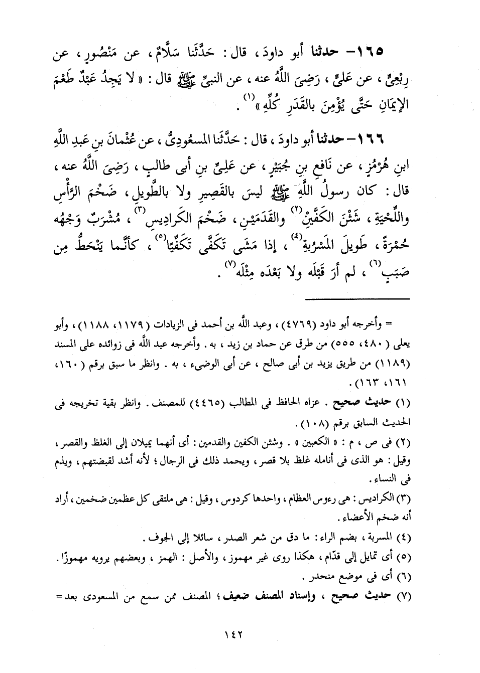 166 - حَدَّثَنَا أَبُو دَاوُدَ قَالَ: حَدَّثَنَا الْمَسْعُودِيُّ، عَنْ عُثْمَانَ بْنِ عَبْدِ اللَّهِ بْنِ هُرْمُزَ، عَنْ نَافِعِ بْنِ جُبَيْرٍ، عَنْ عَلِيِّ بْنِ أَبِي طَالِبٍ رَضِيَ اللَّهُ عَنْهُ، قَالَ: «§كَانَ رَسُولُ اللَّهِ صَلَّى اللهُ عَلَيْهِ وَسَلَّمَ لَيْسَ بِالْقَصِيرِ وَلَا بِالطَّوِيلِ ضَخْمَ الرَّأْسِ وَاللِّحْيَةِ شَثْنَ الْكَفَّيْنِ وَالْقَدَمَيْنِ ضَخْمَ الْكَرَادِيسِ، مُشْرَبٌ وَجْهُهُ حُمْرَةً، طَويلَ الْمَسْرُبَةِ إِذَا مَشَى تَكَفَّى تَكَفِّيًا كَأَنَّمَا يَنْحَطُّ مِنْ صَبَبٍ لَمْ أَرَ قَبْلَهُ وَلَا بَعْدَهُ مِثْلَهُ»