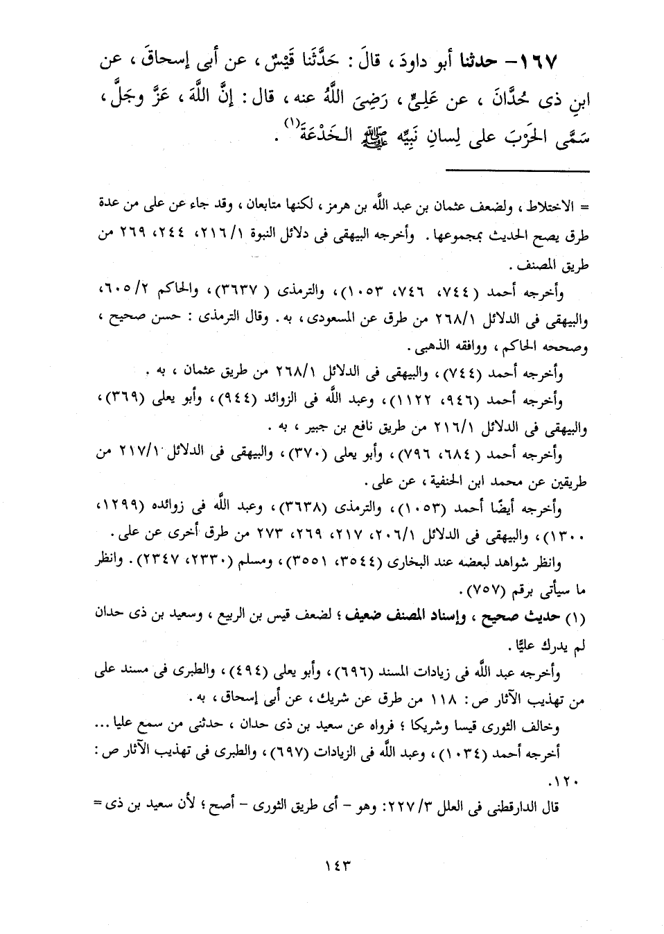167 - حَدَّثَنَا أَبُو دَاوُدَ قَالَ: حَدَّثَنَا قَيْسٌ، عَنْ أَبِي إِسْحَاقَ، عَنِ ابِنِ ذِي حُدَّانَ، عَنْ عَلِيٍّ رَضِيَ اللَّهُ عَنْهُ، قَالَ: «إِنَّ §اللَّهَ عَزَّ وَجَلَّ سَمَّى الْحَرْبَ عَلَى لِسَانِ نَبِيِّهِ صَلَّى اللهُ عَلَيْهِ وَسَلَّمَ الْخَدْعَةَ»