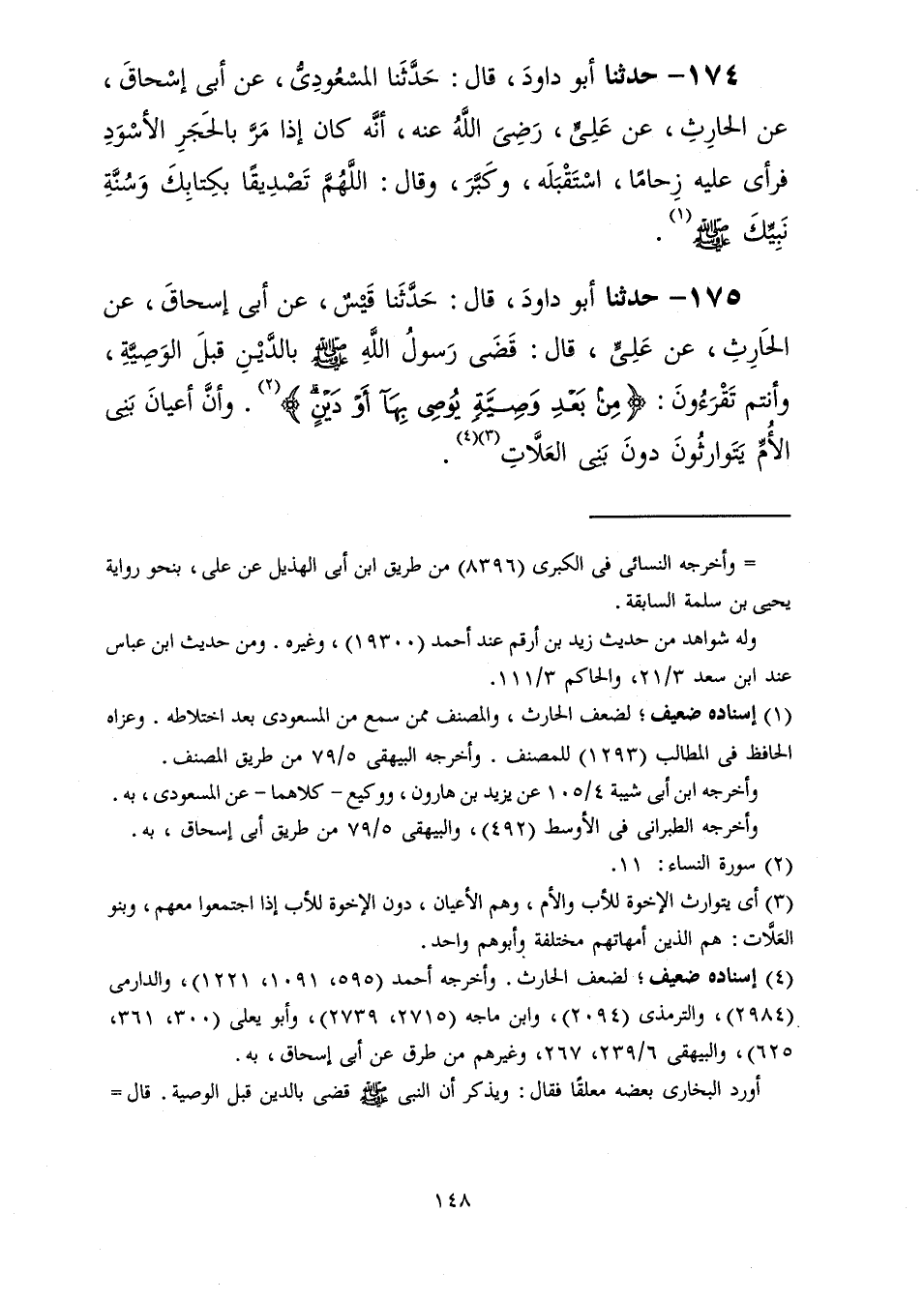 175 - حَدَّثَنَا أَبُو دَاوُدَ قَالَ: حَدَّثَنَا قَيْسٌ، عَنْ أَبِي إِسْحَاقَ، عَنِ الْحَارِثِ، عَنْ عَلِيٍّ قَالَ: " §قَضَى رَسُولُ اللَّهِ صَلَّى اللهُ عَلَيْهِ وَسَلَّمَ بِالدَّيْنِ قَبْلَ الْوَصِيَّةِ وَأَنْتُمْ تَقْرَءُونَ {مِنْ بَعْدِ وَصِيَّةٍ يُوصِي بِهَا أَوْ دَيْنٍ} [النساء: 11] وَأَنَّ أَعْيَانَ بَنِي الْأُمِّ يَتَوَارَثُونَ دُونَ بَنِي الْعَلَّاتِ "