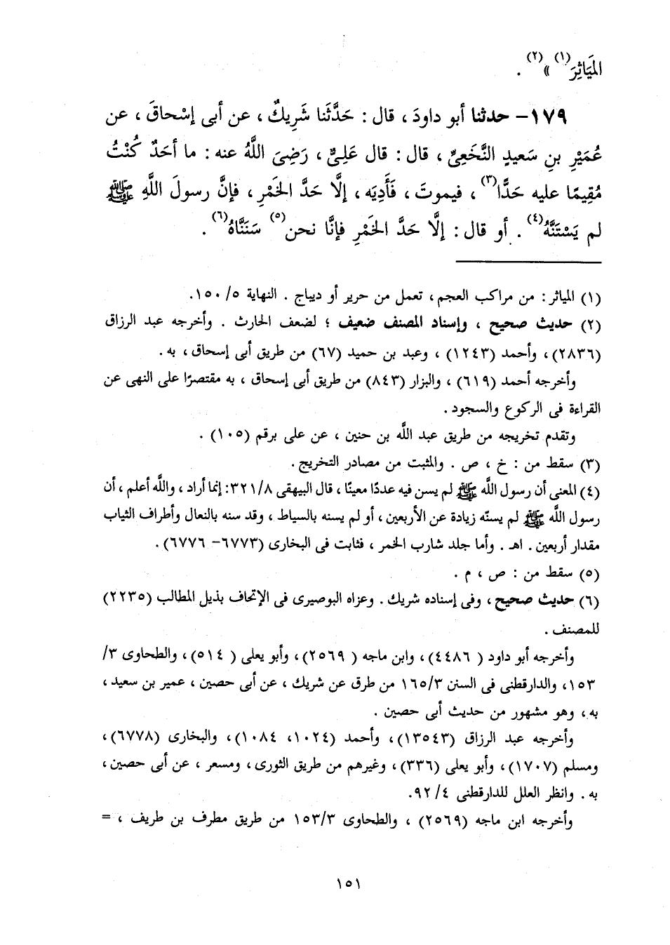 179 - حَدَّثَنَا أَبُو دَاوُدَ قَالَ: حَدَّثَنَا شَرِيكٌ، عَنْ أَبِي إِسْحَاقَ، عَنْ عُمَيْرِ بْنِ سَعِيدٍ النَّخَعِيِّ، قَالَ: قَالَ عَلِيٌّ رَضِيَ اللَّهُ عَنْهُ: " §مَا أَحَدٌ كُنْتُ مُقِيمًا عَلَيْهِ حَدًّا فَيَمُوتَ فَأَدِيَهُ إِلَّا حَدَّ الْخَمْرِ فَإِنَّ رَسُولَ اللَّهِ صَلَّى اللهُ عَلَيْهِ وَسَلَّمَ لَمْ يَسْتَنَّهُ، أَوْ قَالَ: إِلَّا حَدَّ الْخَمْرِ فَإِنَّا نَحْنُ سَنَنَّاهُ "
