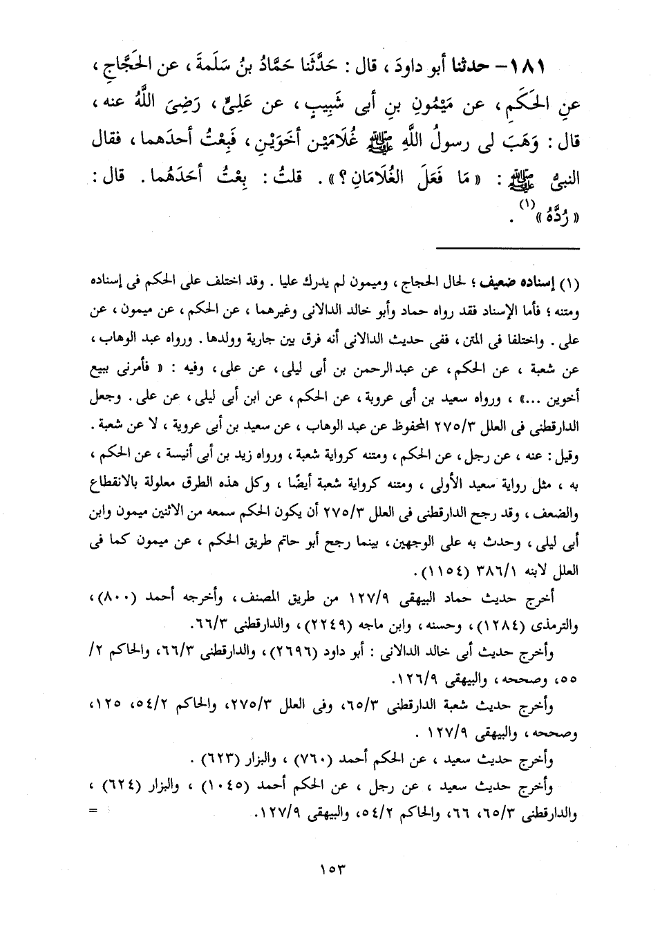 181 - حَدَّثَنَا أَبُو دَاوُدَ قَالَ: حَدَّثَنَا حَمَّادُ بْنُ سَلَمَةَ، عَنِ الْحَجَّاجِ، عَنِ الْحَكَمِ، عَنْ مَيْمُونِ بْنِ أَبِي شَبِيبٍ، عَنْ عَلِيٍّ رَضِيَ اللَّهُ عَنْهُ، قَالَ: §وَهَبَ لِي رَسُولُ اللَّهِ صَلَّى اللهُ عَلَيْهِ وَسَلَّمَ غُلَامَيْنِ أَخَوَيْنِ فَبِعْتُ أَحَدَهُمَا فَقَالَ النَّبِيُّ صَلَّى اللهُ عَلَيْهِ وَسَلَّمَ: «مَا فَعَلَ الْغُلَامَانِ؟» قُلْتُ: بِعْتُ أَحَدَهُمَا، قَالَ: «رُدَّهُ»