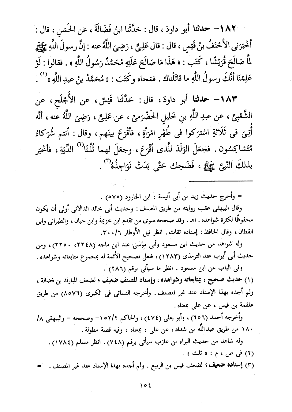182 - حَدَّثَنَا أَبُو دَاوُدَ قَالَ: حَدَّثَنَا ابْنُ فَضَالَةَ، عَنِ الْحَسَنِ، قَالَ: أَخْبَرَنِي الْأَحْنَفُ بْنُ قَيْسٍ، قَالَ: قَالَ عَلِيٌّ رَضِيَ اللَّهُ عَنْهُ: إِنَّ رَسُولَ اللَّهِ صَلَّى اللهُ عَلَيْهِ وَسَلَّمَ لَمَّا صَالَحَ قُرَيْشًا كَتَبَ: «§هَذَا مَا صَالَحَ عَلَيْهِ مُحَمَّدٌ رَسُولُ اللَّهِ» ، فَقَالُوا: لَوْ عَلِمْنَا أَنَّكَ رَسُولُ اللَّهِ مَا قَاتَلْنَاكَ فَمَحَاهُ وَكَتَبَ: «مُحَمَّدُ بْنُ عَبْدِ اللَّهِ»