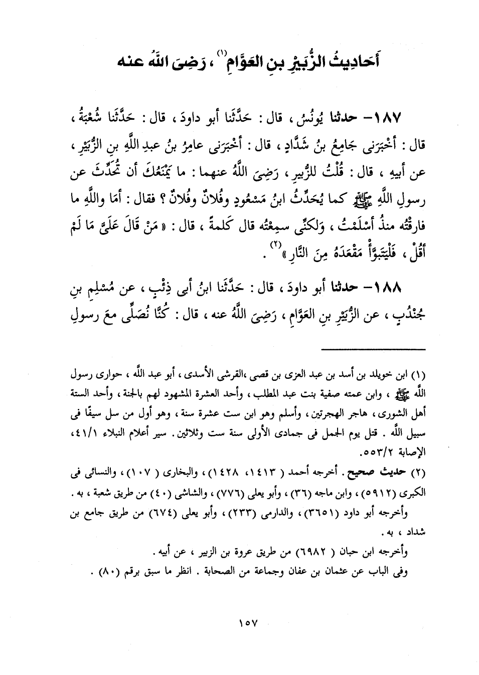 187 - حَدَّثَنَا يُونُسُ، حَدَّثَنَا أَبُو دَاوُدَ قَالَ: حَدَّثَنَا شُعْبَةُ، قَالَ: أَخْبَرَنِي جَامِعُ بْنُ شَدَّادٍ، قَالَ: أَخْبَرَنِي عَامِرُ بْنُ عَبْدِ اللَّهِ بْنِ الزُّبَيْرِ، عَنْ أَبِيهِ، قَالَ: قُلْتُ لِلزُّبَيْرِ رَضِيَ اللَّهُ عَنْهُمَا: مَا يَمْنَعُكَ أَنْ تُحَدِّثَ عَنْ رَسُولِ اللَّهِ صَلَّى اللهُ عَلَيْهِ وَسَلَّمَ كَمَا يُحَدِّثُ ابْنُ مَسْعُودٍ وَفُلَانٌ وَفُلَانٌ؟ فَقَالَ: أَمَا وَاللَّهِ مَا فَارَقْتُهُ مُنْذُ أَسْلَمْتُ وَلَكِنِّي سَمِعْتُهُ قَالَ كَلِمَةً، قَالَ: «§مَنْ قَالَ عَلَيَّ مَا لَمْ أَقُلْ فَلْيَتَبَوَّأْ مَقْعَدَهُ مِنَ النَّارِ»